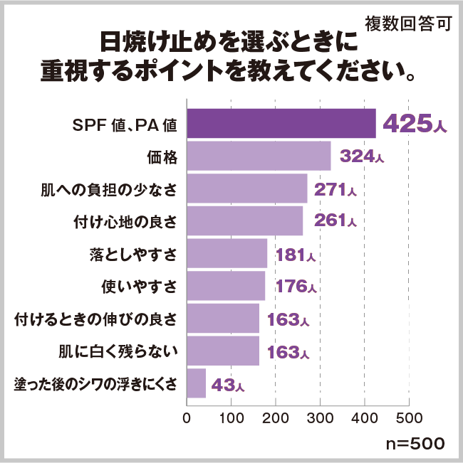 今回のアンケートで日焼け止めを選ぶときのポイントをお聞きしたところ、圧倒的に「SPF値、PA値」という答えが多かったのですが、やみくもに数値の高い日焼け止めを使えばそれだけ肌に負担がかかります。