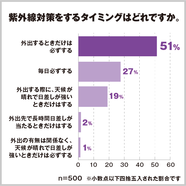 次に紫外線対策をするタイミングですが、「外出する時だけする」「外出時、天気が良いときだけ」と回答した人が7割になりました。