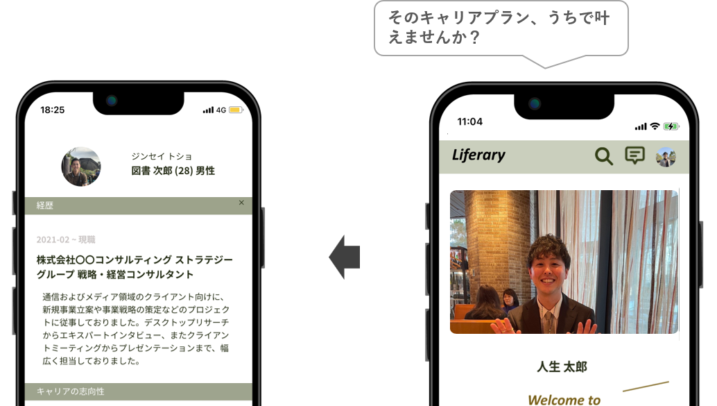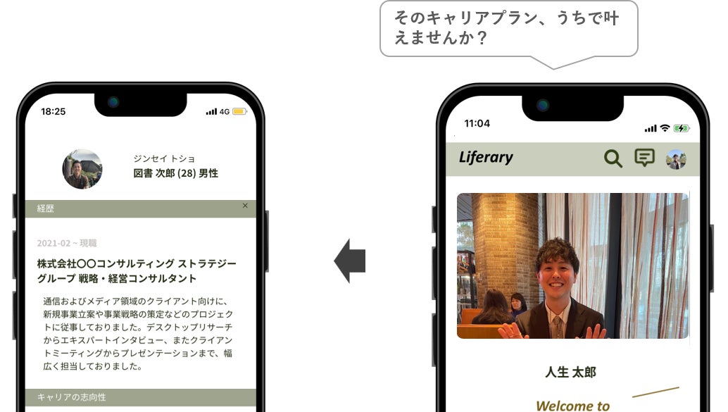 そんな彼らへ、いきなり求人情報やスカウトが届くような体験ではなく、自分に合った選択肢を実例から知り、満足のいくキャリア選択ができる機会を届けたい、という想いから、Liferaryは生まれました。