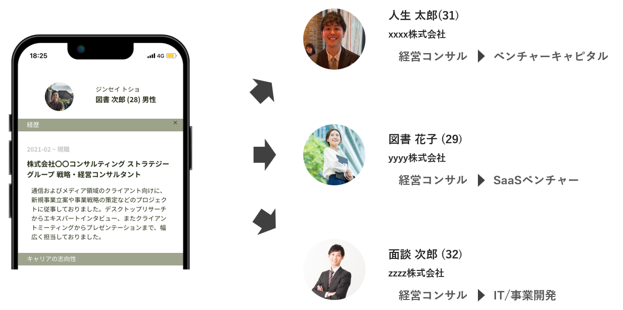 候補者は、これまでの経歴やこれからのキャリアイメージをインプットに共通項のあるロールモデルと出会い、キャリア面談を依頼できます。