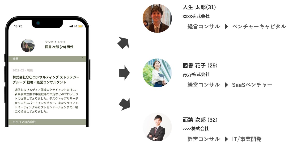 従業員と候補者が、お互いのキャリアストーリーを接点に出会うサービスです。