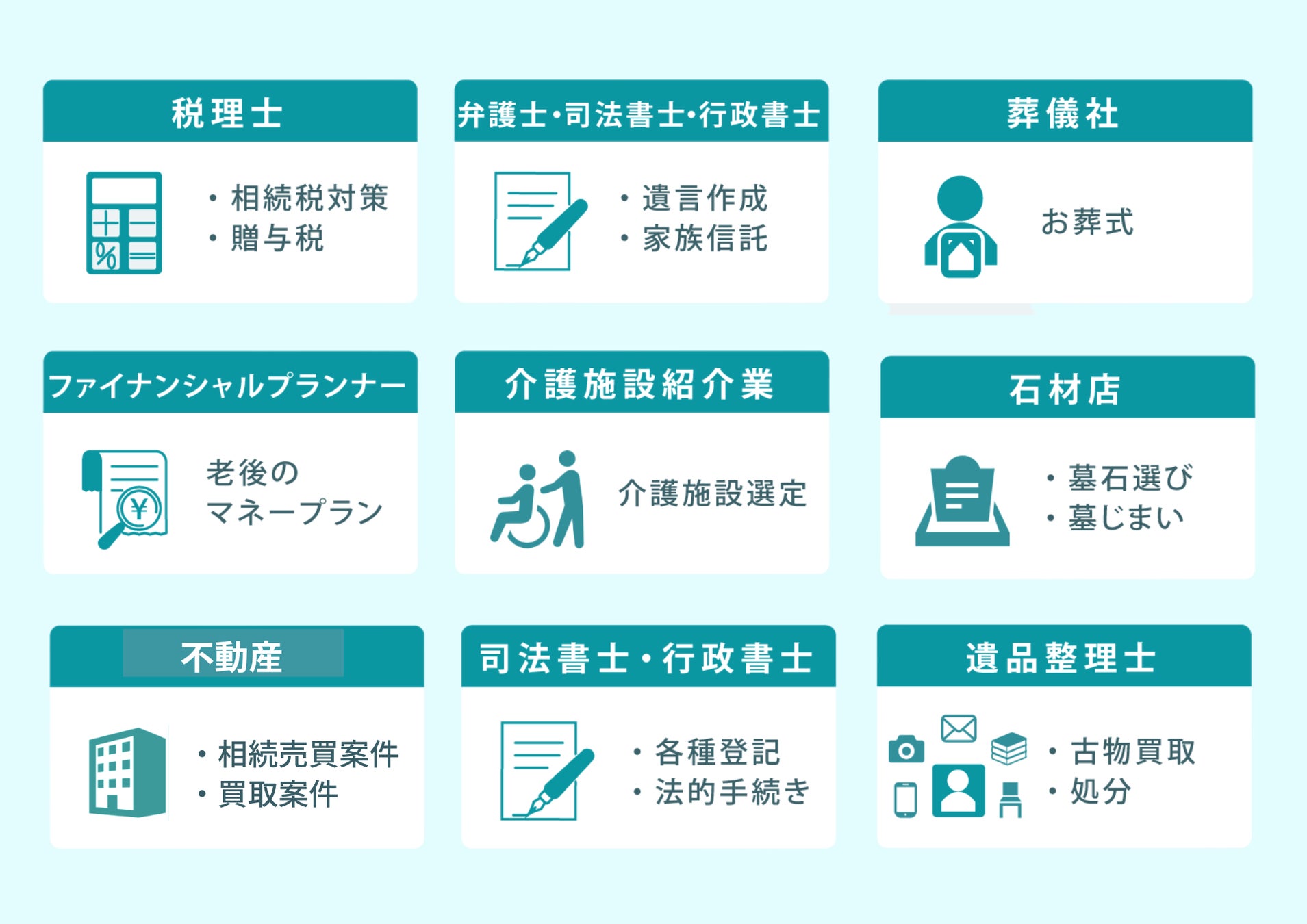 現状のマーケットでは相続終活に関する各種手続きやサービスを検討される際、相続終活における各種士業に法的手続き・不動産・介護・保険・葬儀・墓・遺品整理・相続終活周辺サービスに関して、それぞれの利用される方の相続終活におけるライフステージに合わせ、連続的に他業種を必要なサービスごとに1業種ずつ比較検討の上、専門家選定を行っている現状です。