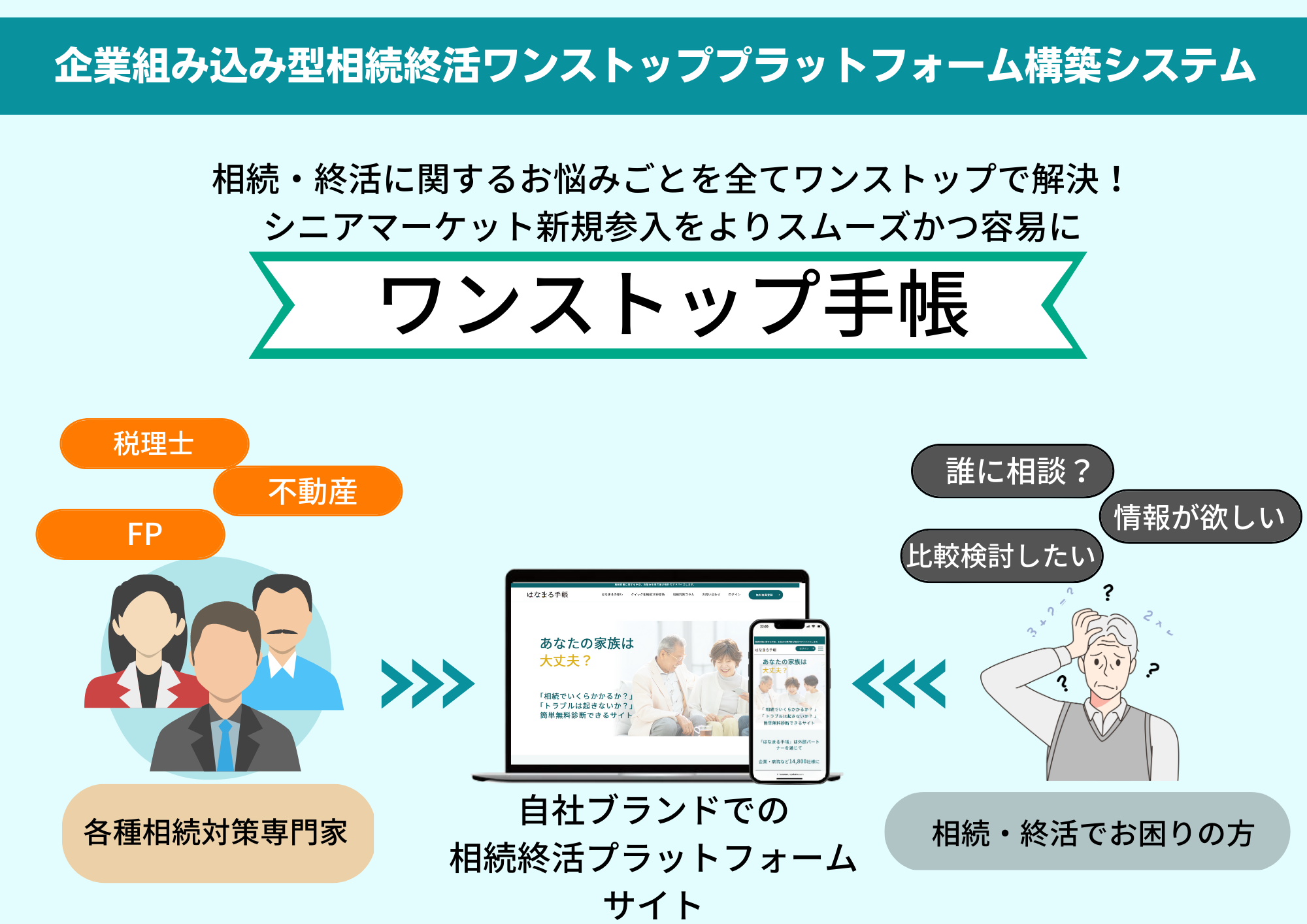 【ビジネスモデル特許取得】相続終活マーケットの企業組み込み型ワンストッププラット構築システム「ワンストップ手帳」