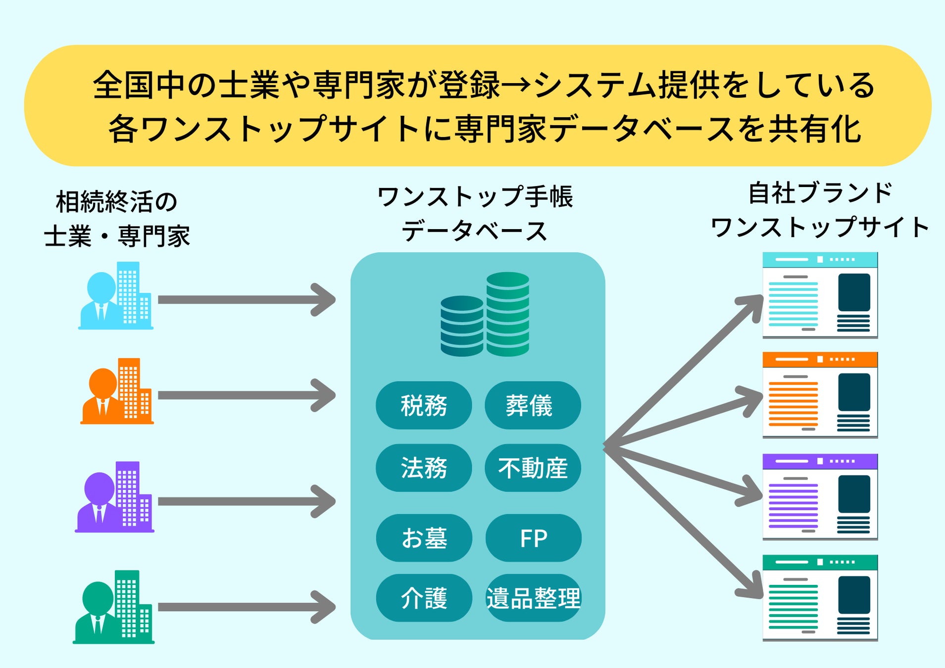 ワンストップ手帳では、業界内の各種専門団体やグループ企業との協力のもと全国の専門家情報を全国約1000社と直接的な契約を行なっており、ワンストップ手帳内の専門家データベースを活用し、ワンストップサイトを運営されたい企業向けに相続終活の診断機能付きワンストップ相談プラットフォームをOEM提供にて行なっております。