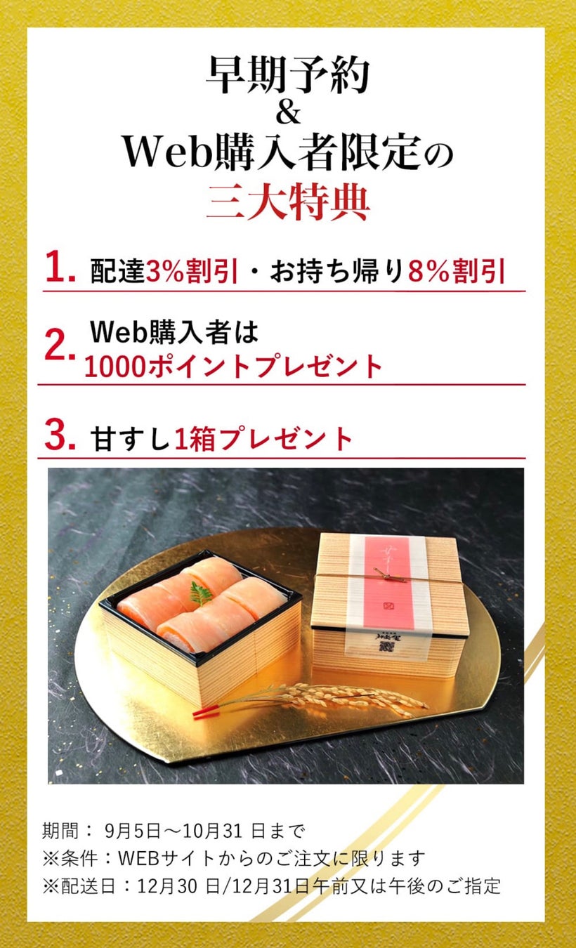 特典1「WEB注文で最大8%割引」、特典2「WEB注文で1000p付与」、特典3「甘すし」プレゼント※10月31日まで