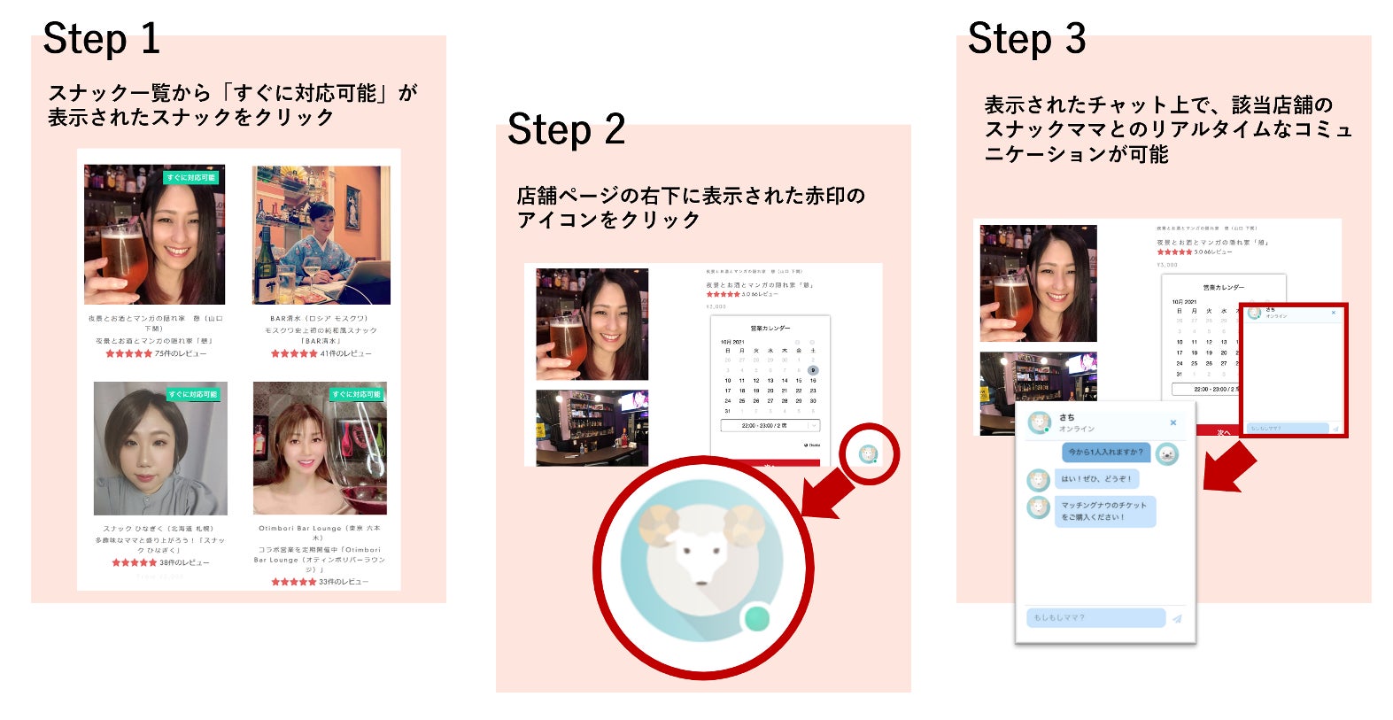 ご利用されるお客様はオンラインスナック横丁にアクセスし、スナック一覧から好みのスナックページにアクセスし表示されたもしもしママボタンからスナックママとのリアルタイムなチャット接客が可能となります。またスナックママはお客様のメッセージをLINEで受信、返信でき、ITに関する知識の如何に関わらずやりとりが簡単にできるシステムとなっております。商品やサービスのオンライン化が普及する昨今、新たな価値観として、対面での双方向コミュニケーションの重要性も見直され、オンラインとオフラインを融合したサービスに改めて関心が集まっています。オンラインスナック横丁は、リアルとオンラインの利点を最大限に活用する仕組みを構築し、新たなスナック利用者を創出していくと共に、スナック業界のDXを推進していく所存です。
