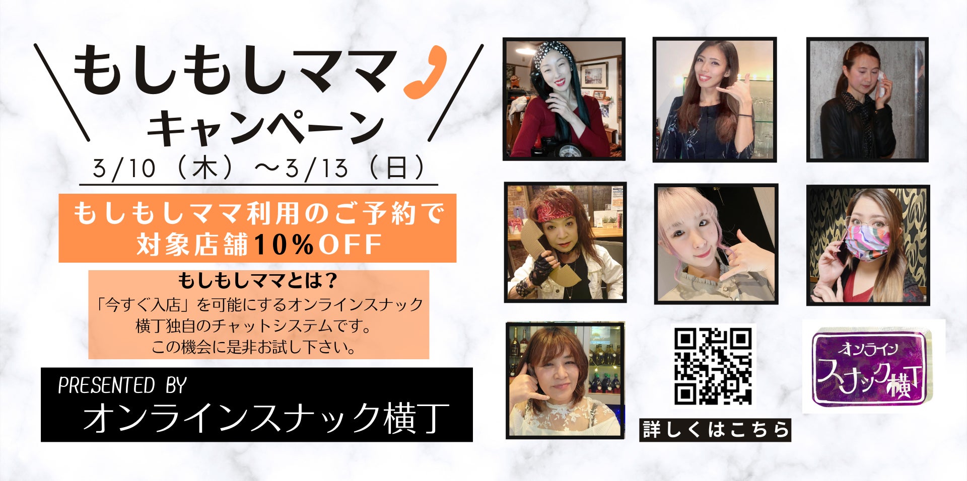 【キャンペーン内容】対象期間内にオンラインスナック横丁の「もしもしママ」サービスを利用し、対象店舗のチケットを購入すると10%OFFとなります。期間中、何度でも利用可能です。