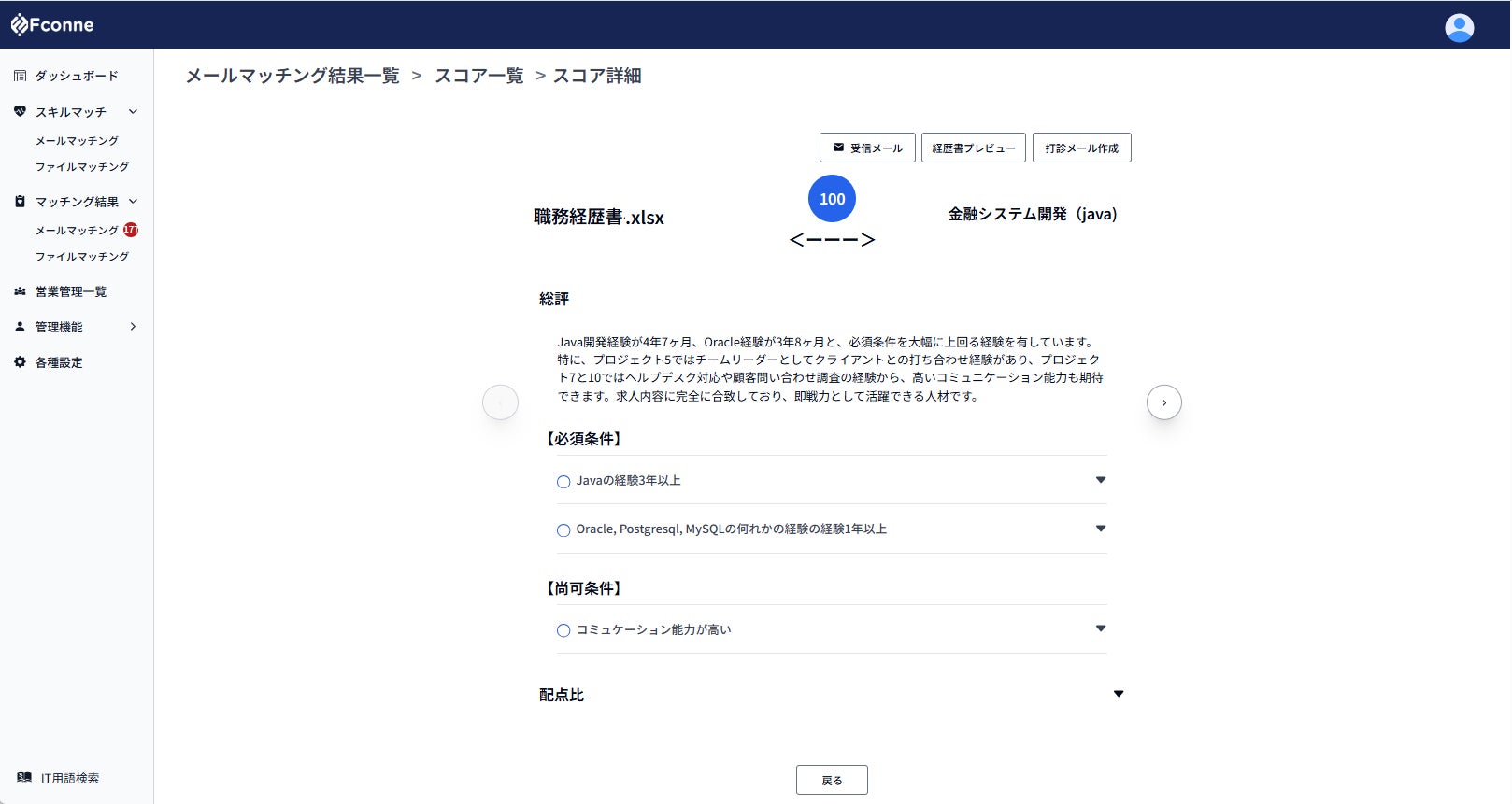メールマッチング機能: 画面から入力した案件情報と、メールから自動で抽出したエンジニア情報・経歴書ファイルをマッチングし、評価内容とマッチ度を画面に表示します。