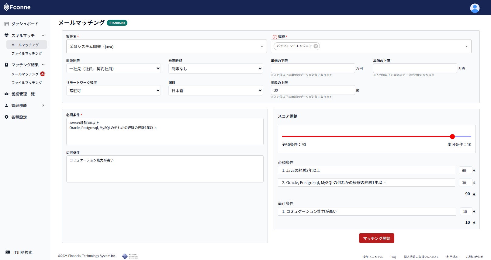SES業界では、案件情報に対し、大量のエンジニア経歴書から最適な人材を探し出す作業が、営業担当者の大きな負担となっています。「Fconne」は、このような課題を解決するために開発されました。お客様が画面から入力した案件情報と、メールから自動で取得したエンジニア情報・経歴書をAIがマッチングすることで、最適な人材を迅速に特定し、営業効率の向上と顧客満足度の向上に貢献いたします。