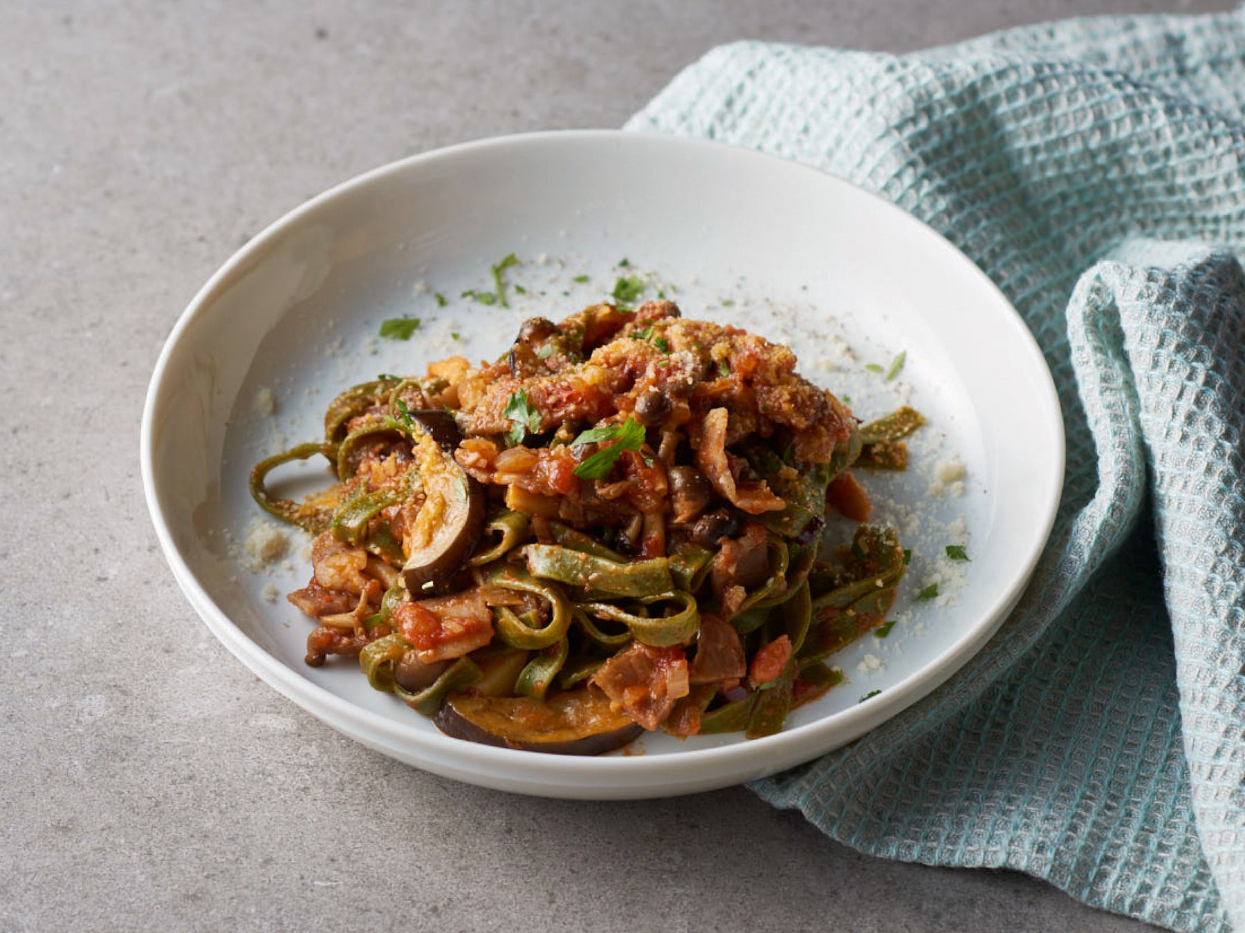 ■メニュー名:茄⼦とベーコン、しめじのトマトソース パブロバを練りこんだフェッ トチーネ