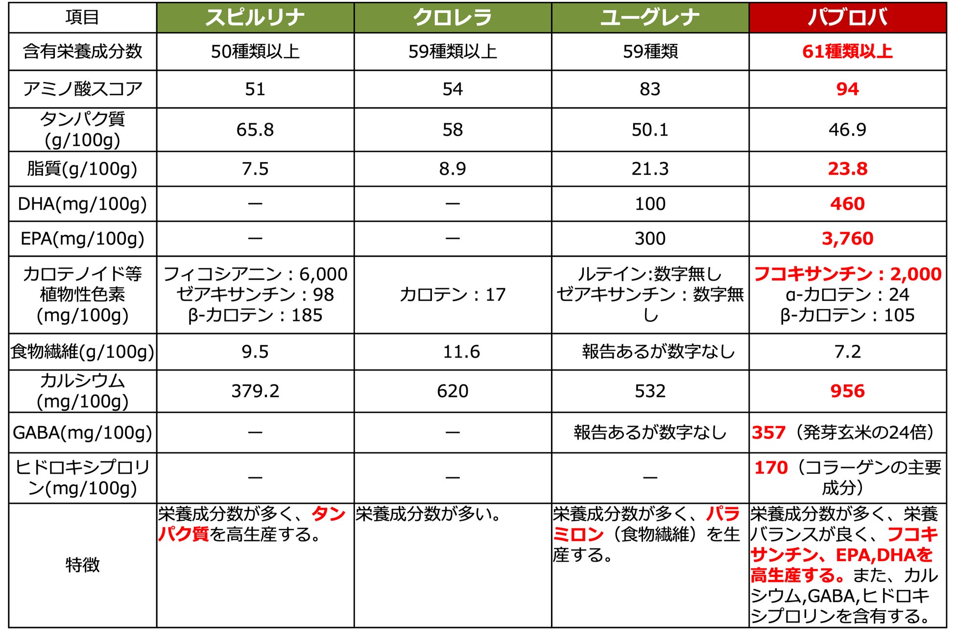 注)スピルリナ、クロレラ、ユーグレナについてはインターネット上の情報から引用
