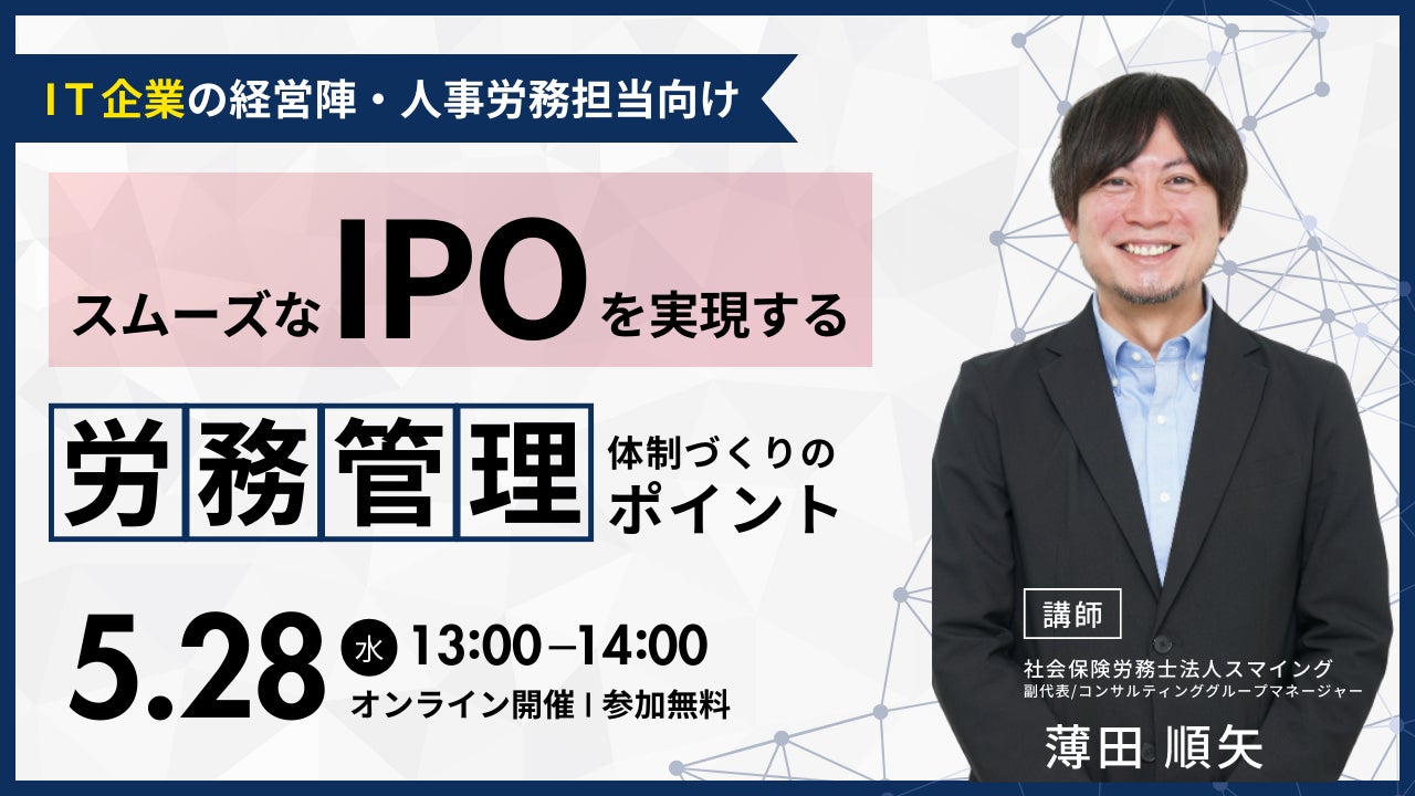 IT企業の人事労務に強い社会保険労務士法人スマイング(所在地:東京都渋谷区)は、「【スムーズなIPOを実現する、<労務管理>体制づくりのポイントセミナー」を2025年5月28日(水)に無料開催いたします。