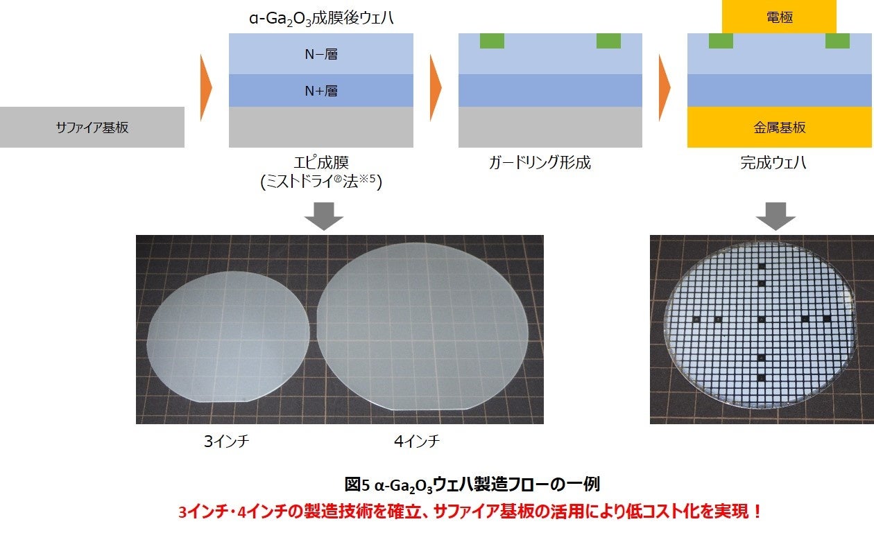 α-Ga₂O₃ウェハ開発では、4インチサイズまでのα-Ga2O3エピ成膜技術、3インチサイズまでのウェハ製造技術を確立いたしました(図5)。2025年中には4インチサイズでのウェハ製造技術の実証を完了する見込で、大口径化によるコストメリットと生産性向上を図ります。なお、使用しているサファイア基板は、4インチサイズが市場で最も多く使用されており、同一サイズの炭化ケイ素(SiC)基板の1/10~1/50程度の価格で流通していることから、今後の低コスト化実現のための基盤技術が大幅に進展したことを意味しております。