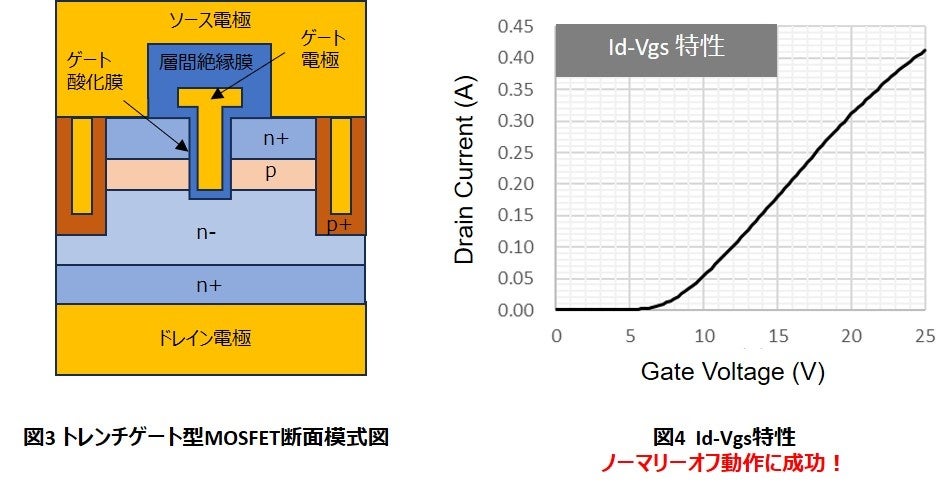 MOSFETにおいて、プロセスの最適化や独自のMOS界面制御技術を適用することで、トレンチゲート型MOSFETのノーマリーオフ動作の実証に成功いたしました(図3・図4)。こちらも新規P型半導体 α-(IrGa)₂O₃ の材料ポテンシャルを最大限活用して製品化に向けた開発を進めて参ります。
