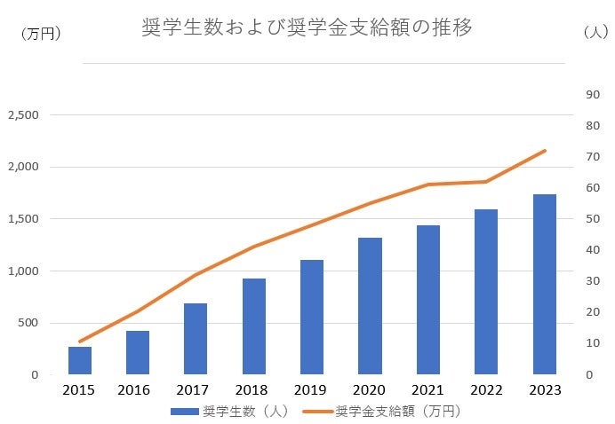 奨学生数および奨学金給付金額は2015年の開始以降、増加を続けています。2020年以降は新型コロナウィルス感染症の影響で応募者数が急増し、前回の2023年度(第9期)奨学生は新たに採用された新入学の21名と継続を含めて58名(全学年合計)となり、2023年度の奨学金給付見込み額は2,160万円に上っています。