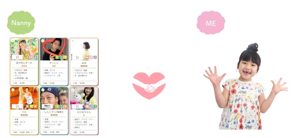 NannyMEは、子どもの見守りをして欲しい家族(MEミー)と 保育士や講師(Nannyナニー:以下Nanny)をオンラインでつなぐ対面型みまもり保育サービスです。サイトを開いてクリックするだけで、みまもり保育がすぐ依頼でき、30分から利用できます。登録Nannyは、保育資格や教育免許をもった子どもと遊ぶプロを中心に、さまざまなスキルを持ったメンバーばかり。みまもり保育中に、伴奏や読み聞かせ、動物や昆虫、手芸、 英会話など子どもの知的好奇心を育みたいそんな希望にもお応えできます。核家族化の現在、保護者だけでは子供に伝えることが難しい新たな人生の価値観、刺激、面白さ等、子供の可能性が広がるサービスです。