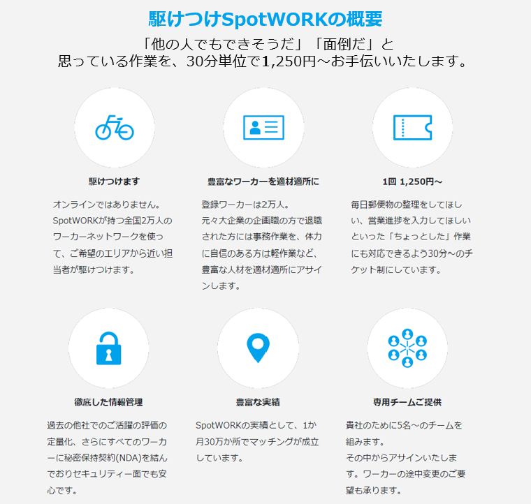 オンラインで秘書のようなサービスが多い中、SpotWorkは、豊富なワーカーが「駆けつける」、そして、継続していただける安価な価格設定であることが大きな特徴です。