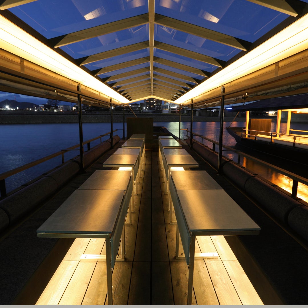船内両側にベンチシートを配置し下足のままご利用いただけるほか、調光可能な間接照明が船内を優しい灯りで包みます。時間帯によって、鵜匠から解説を特別にしてもらえたり、一番近くて鵜飼が鑑賞できるなどVIP対応です。優雅なひと時をお過ごしいただけます。(こちらは貸切船のみの対応です)