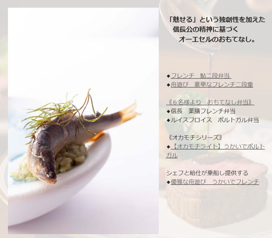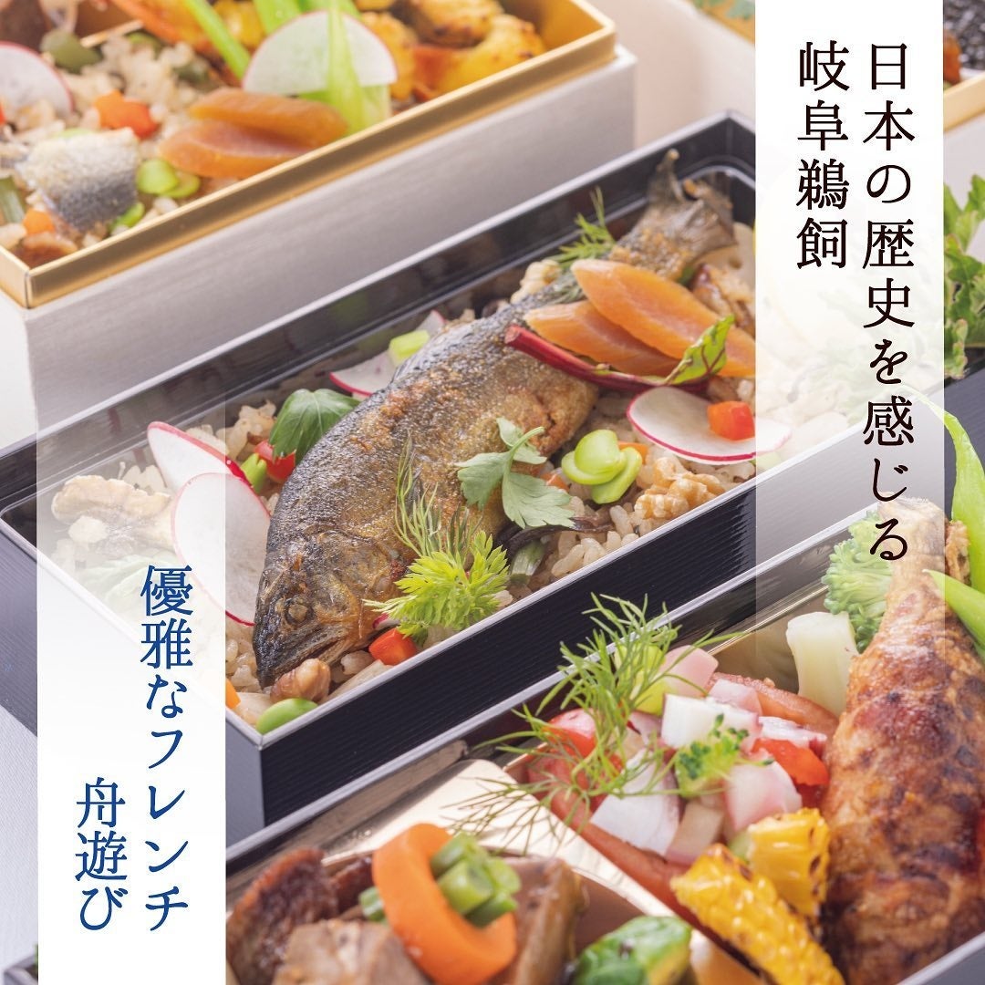 岐阜の食材である【鮎】を使用し、フレンチの技法で仕上げたフレンチ鮎二段弁当、フレンチの高級食材と【飛騨牛】を使用したフレンチ二段重、岐阜のゆかりある宣教師「ルイスフロイス」の故郷のポルトガル料理をコースに仕立てた「鵜飼でポルトガル」のシリーズなどを商品を展開し、それらのフレンチと乗合船をセットした【鵜飼パック】、団体客向けには貸切船とセットプラン【貸切プラン】を展開。
