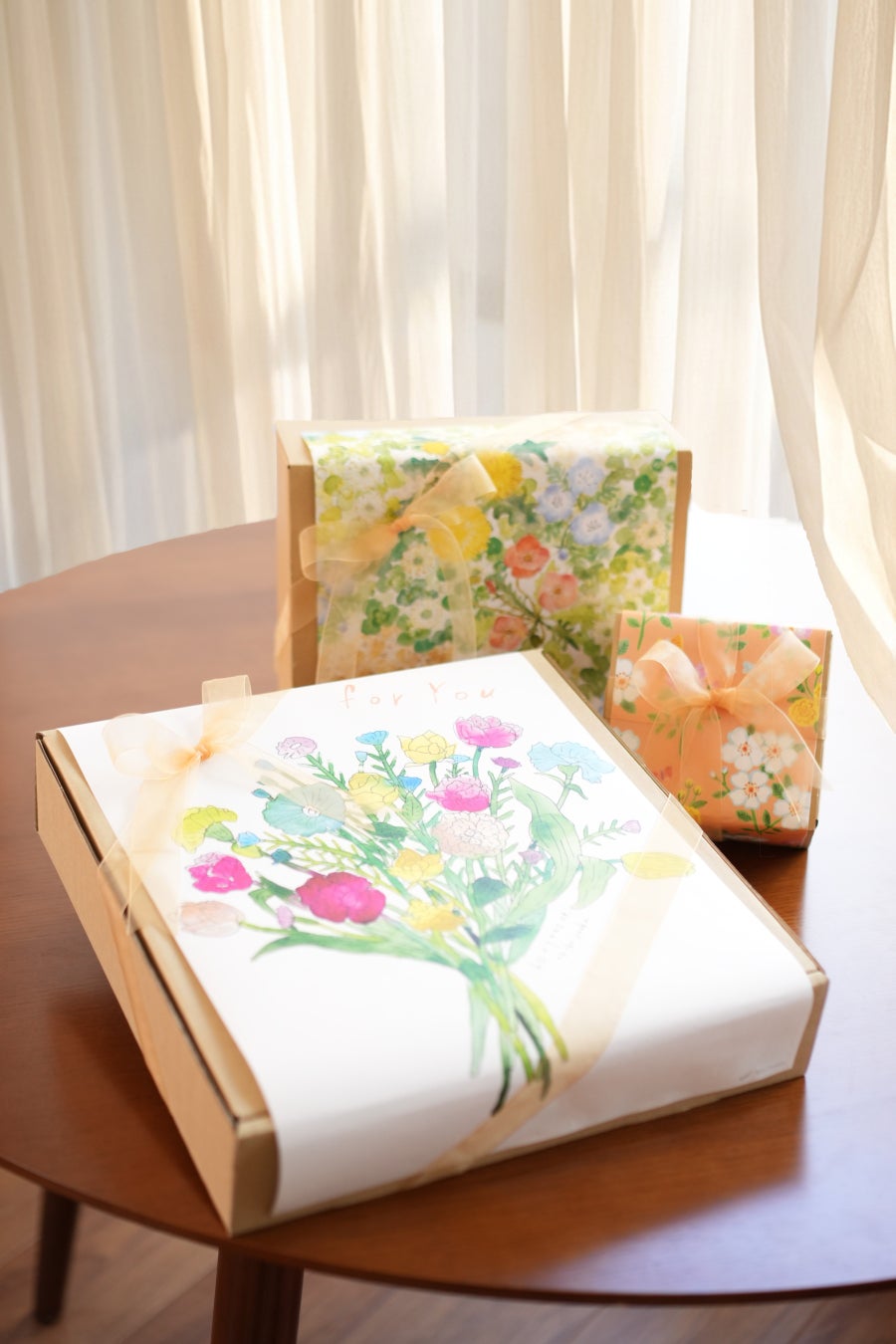 お母様への感謝を伝えるギフトにぴったりの、優しい花柄のラッピングをご用意いたしました。