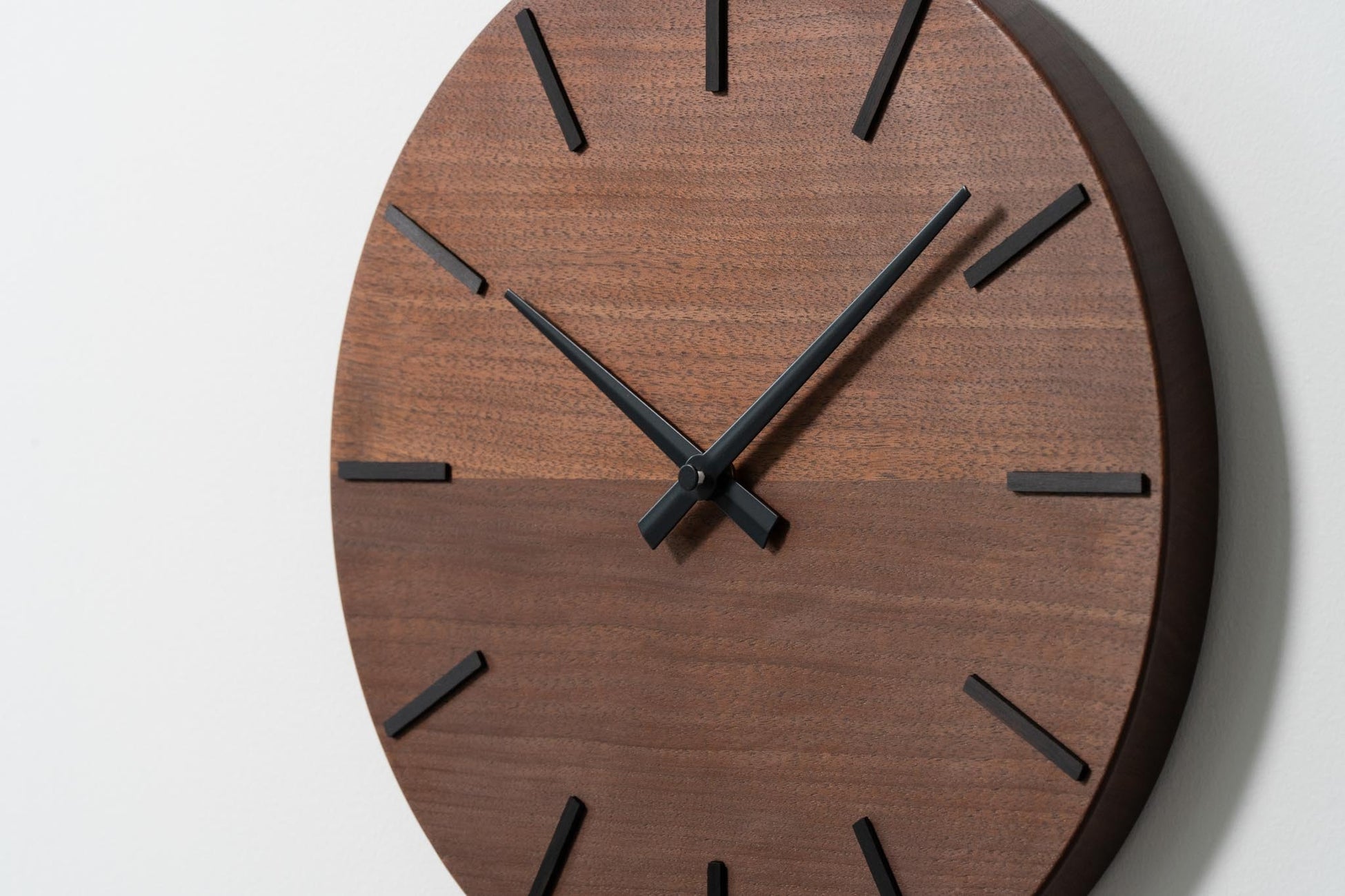 本時計の象徴となるのは、伝統技法「木象嵌(もくぞうがん)」で表現されたバーインデックスです。