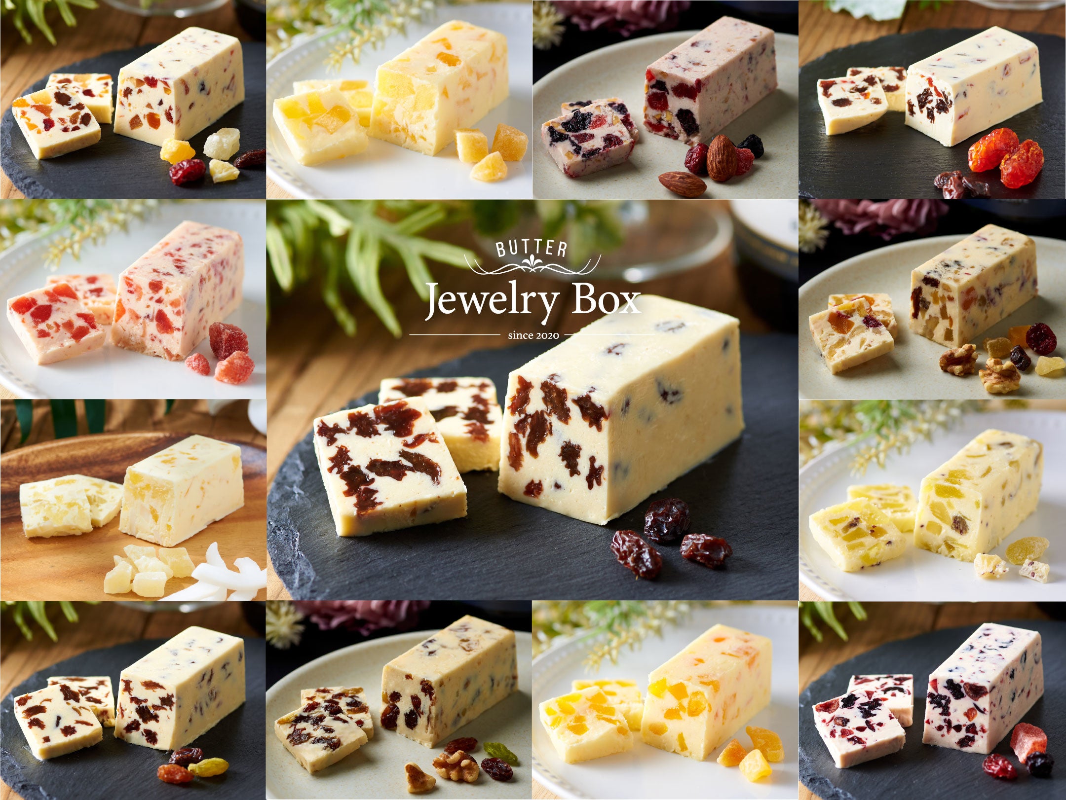 色とりどりの宝石をモチーフとした3シリーズ13種類のフレーバーバターがJewelry Boxの魅力。それぞれのドライフルーツに応じてブレンドが異なる2種類のバターベースが深い味わいを実現。