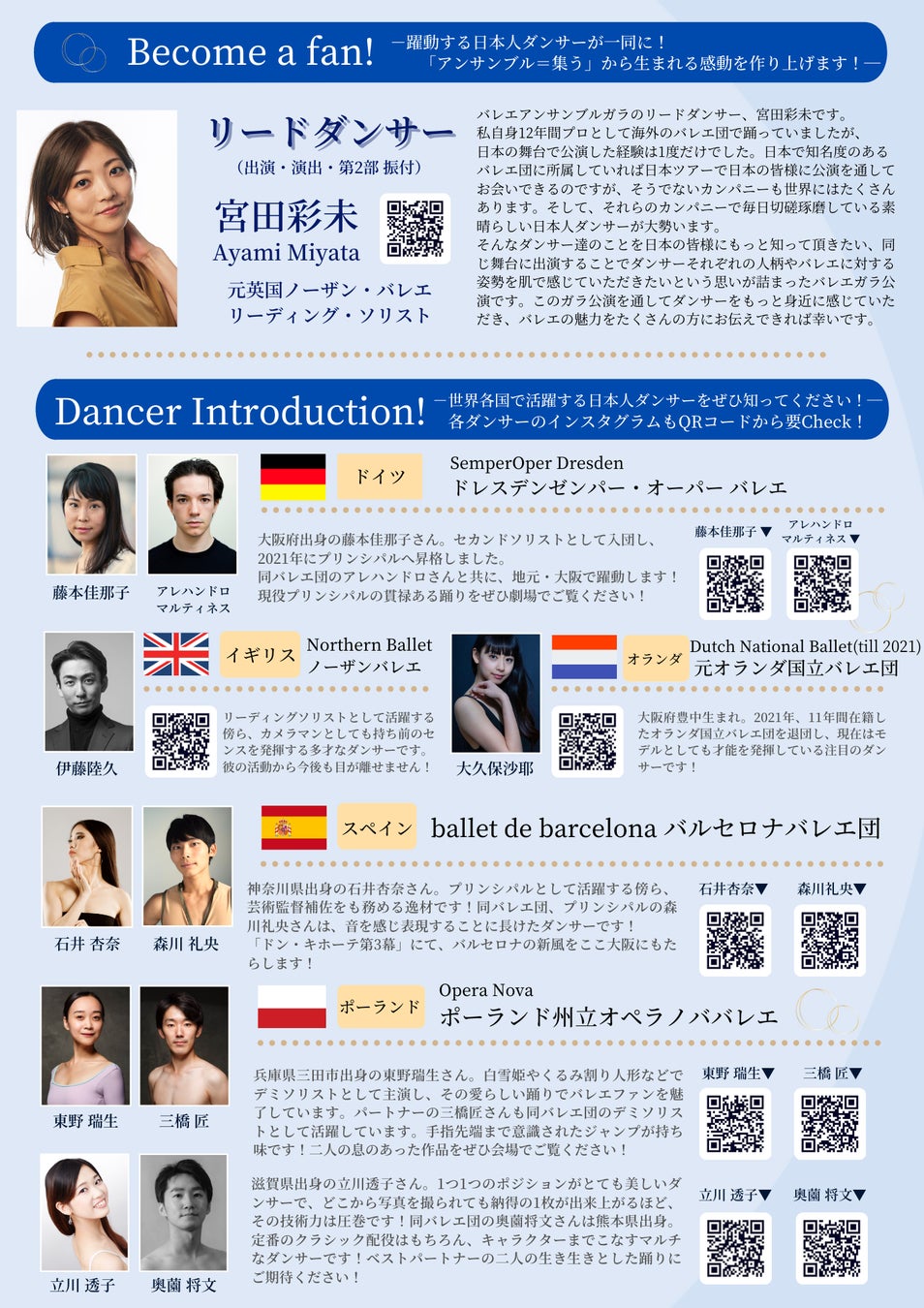 本舞台公演は、海外で活躍中のバレエダンサーや日本のバレエ団やフリーのダンサーたちが共演するバレエガラコンサートです。アンサンブルはフランス語で「共に、統一、調和」を意味します。ダンサー・共演者が集い、観客の皆さまと共に素晴らしい時間を共有できる場であるように、という思いが込められています。コロナ禍で失われた「集う喜び・感情を共有する喜び」をこの場所で!世界各国で躍動する日本人ダンサーの熱い思いのこもった舞台に是非ご期待ください。