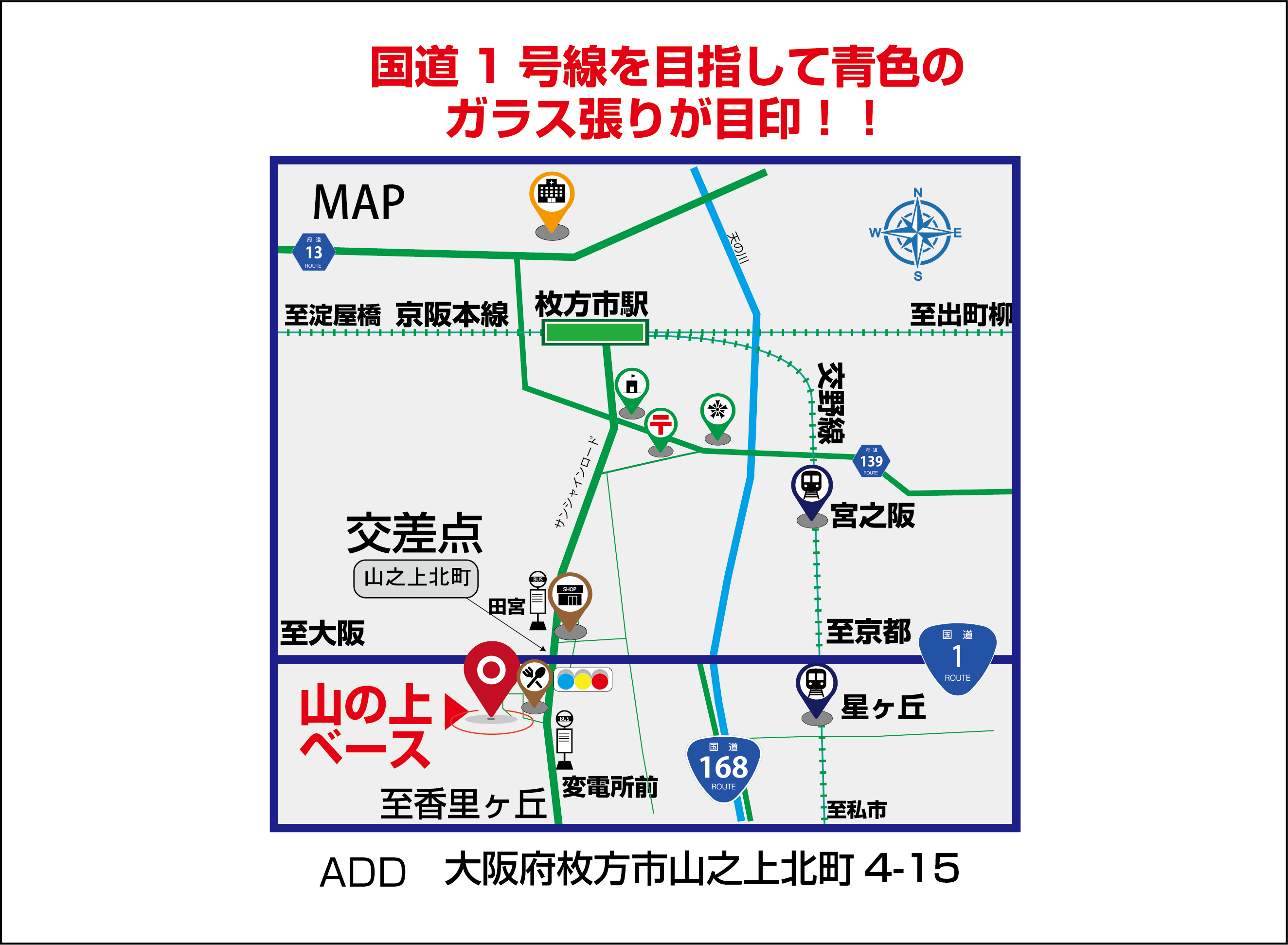 国道1号線沿いに位置し、京阪バス「変電所前」すぐというアクセス性を活かし、地域に開かれた拠点として展開しています。