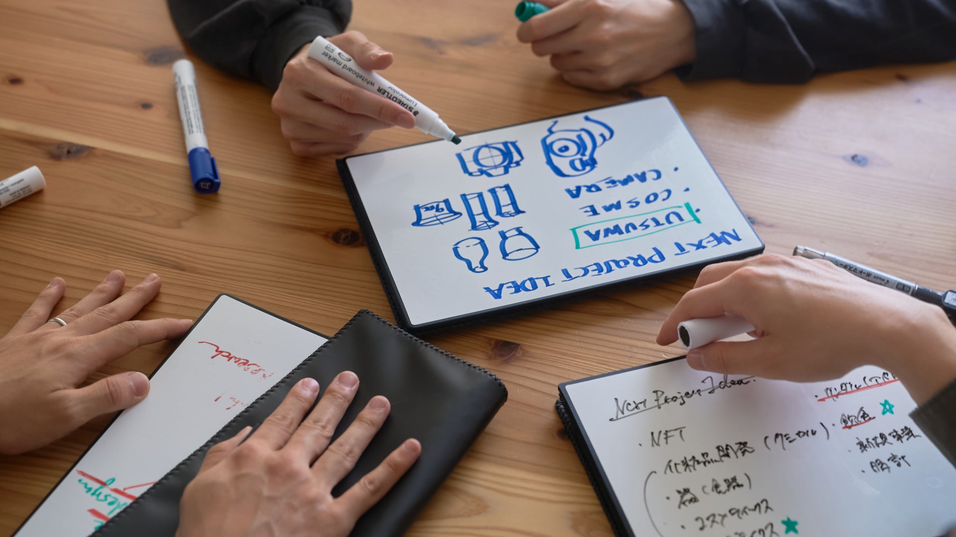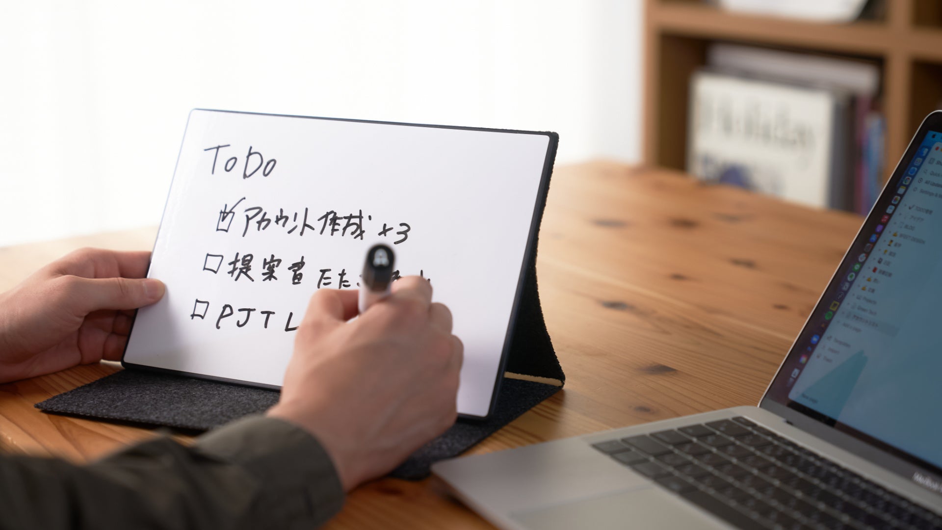 書いたメモや図解、アイディア、ToDoリストを「立てた状態で眺められる」よう、自立できる仕組みを取り入れました。スマホで撮影するときには、天井の照明器具の映り込みを少なくする効果もあります。