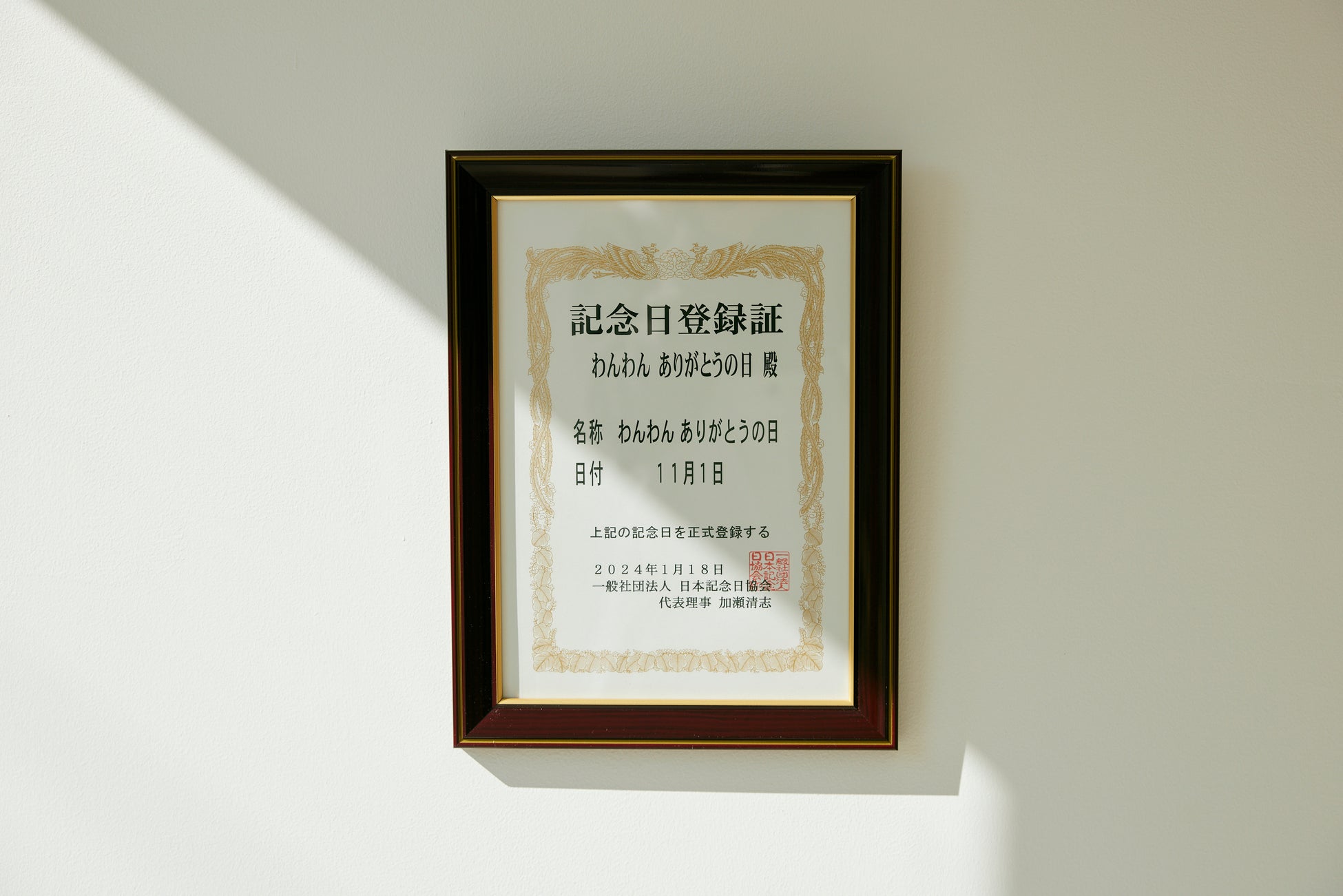 犬専門フォトスタジオ わんわん ありがとうの日が、11月1日を「わんわん ありがとうの日」として制定し、日本記念日協会に正式に認定されました。