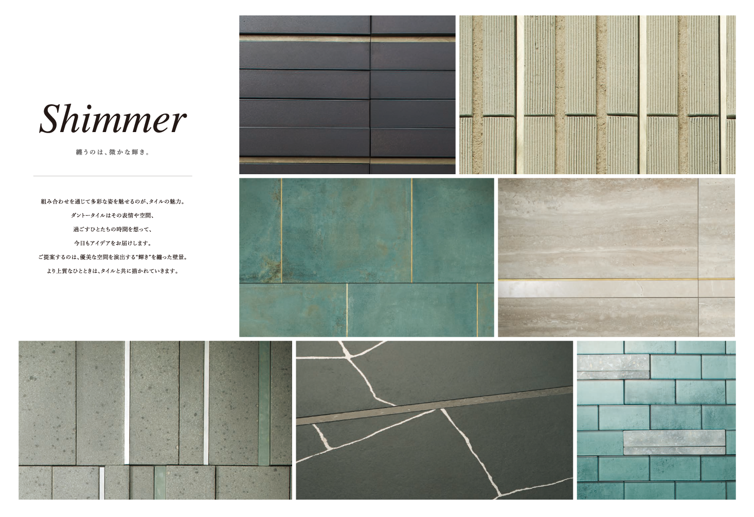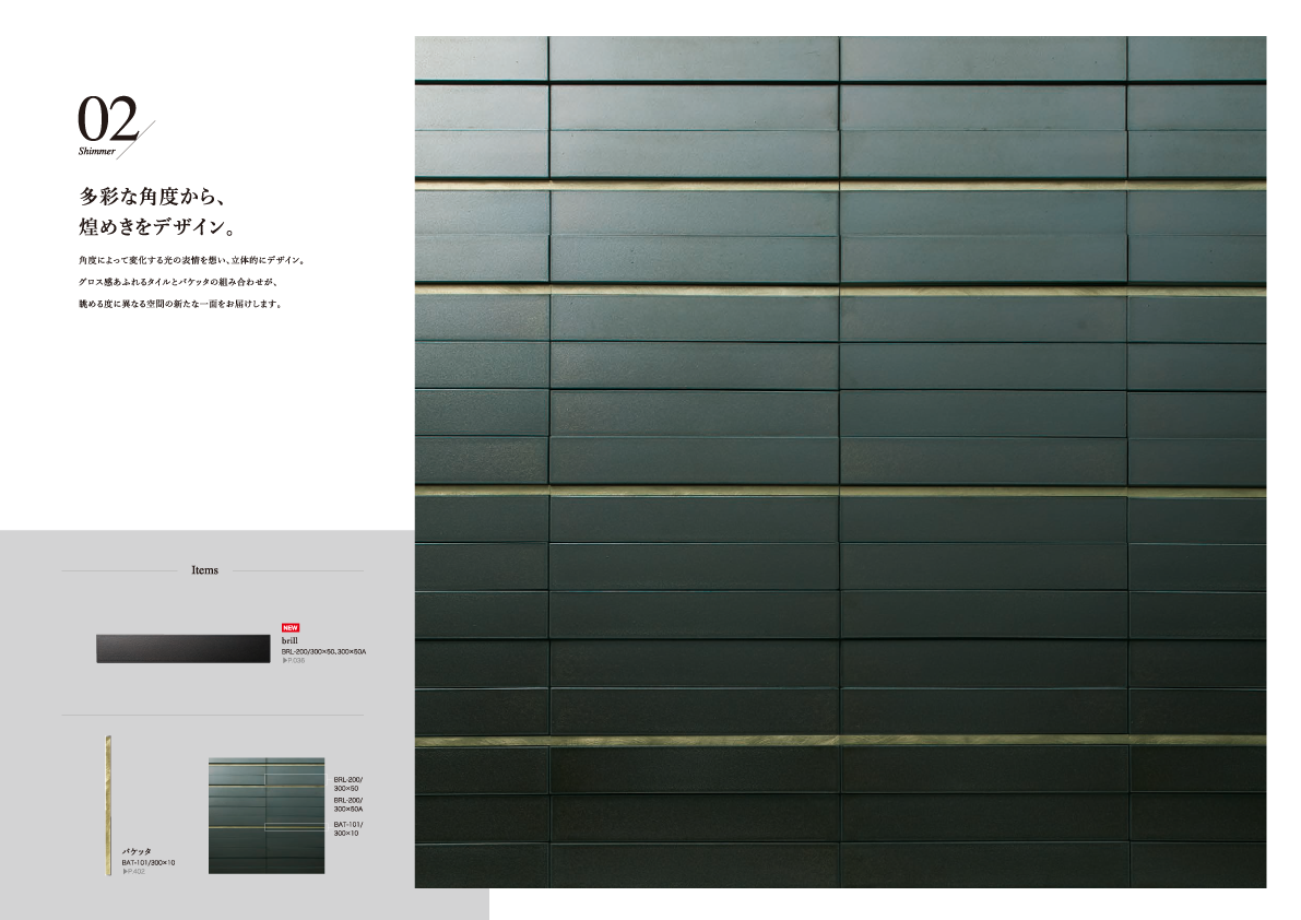 「タイルで世界の想像力を刺激する・日々発想するタイル」をコンセプトに新製品に技術やストーリーにこだわった国産品や世界的なトレンドを取り入れた海外品を新製品ラインナップに加え、組み合わせによるパターン張りのコンテンツなどを更に充実させています。