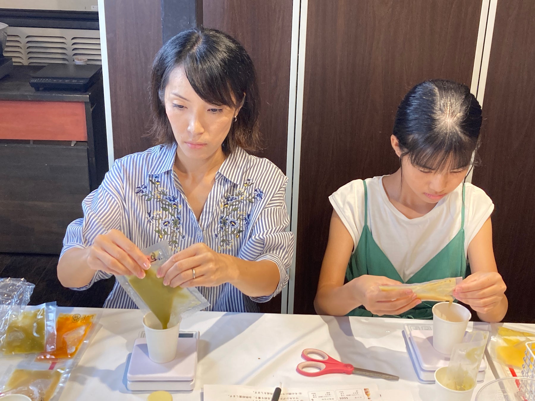 体験内容:自分でラベルをデザインしたボトルに、6種類の調味料と5種類のお酢の組み合わせから自分で味を選んで、お好みの辛さやゆずの風味に調整して詰めることができます。お1人につき瓶2本分のゆずすこを作ってお持ち帰りいただけます。ご自宅で焼いたお肉や、お刺身、サラダ、ラーメンなどにかけたり和えたりしてお楽しみください。さっぱりとして、少しピリッと来るアクセントがやみつきになること間違いなし!