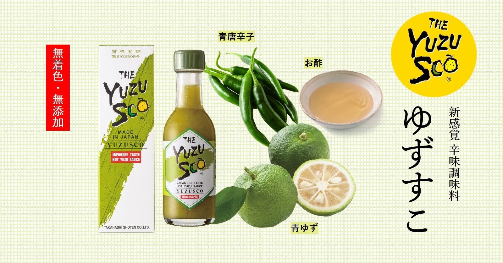 九州生まれの薬味として知られる「ゆずこしょう」。高橋商店でも古くからゆずこしょうを製造していましたが、ある時お客様から「もっとお料理と味がなじみやすい、使い勝手の良いゆずこしょうがほしい」というお声を頂き、開発したのがYUZUSCOの始まりです。ゆずこしょうをお酢で伸ばした「液体ゆずこしょうYUZUSCO」は、液体にすることでどんなお料理にもムラなくなじみ、片手でパパッとかけることができます。原料には「ゆず皮」「酢」「こしょう(唐辛子)」「食塩」のみを使い、無着色・無添加のシンプルな調味料です。味噌汁やうどん、鍋などの和食はもちろん、ピザやカルパッチョなどの洋食との相性も抜群です。