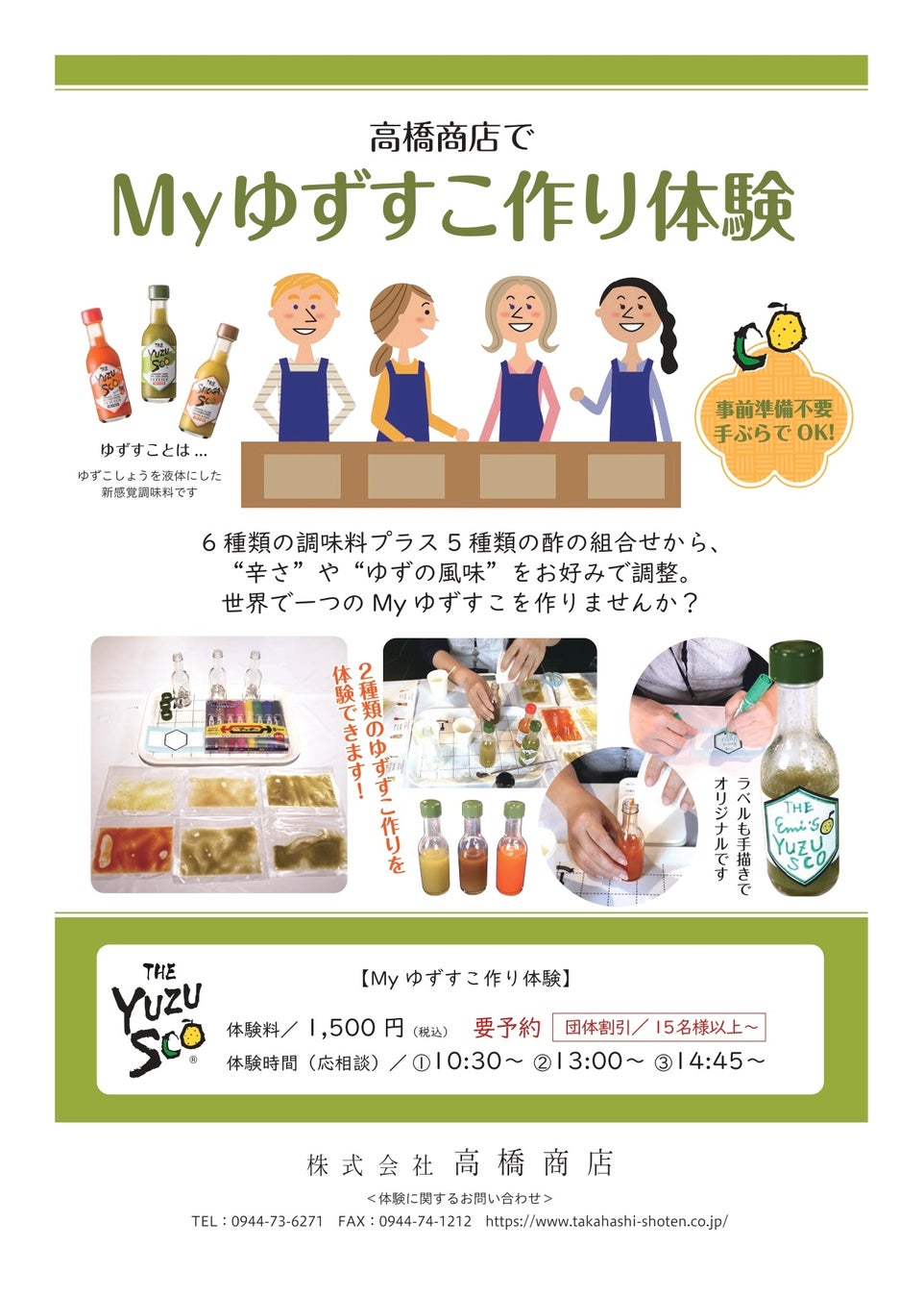 株式会社高橋商店(本社:福岡県柳川市、代表取締役:高橋努武)は、代表商品である液体ゆずこしょう「YUZUSCO」の味をオリジナルでカスタムできる体験を、行楽シーズンに向けて高橋總本舗限定でスタートさせました。自分でラベルをデザインしたボトルに、6種類の調味料と5種類のお酢の組み合わせから自分で味を選んで、お好みの辛さやゆずの風味に調整して詰めることができます。ご予約の上、事前準備不要で体験いただけます。