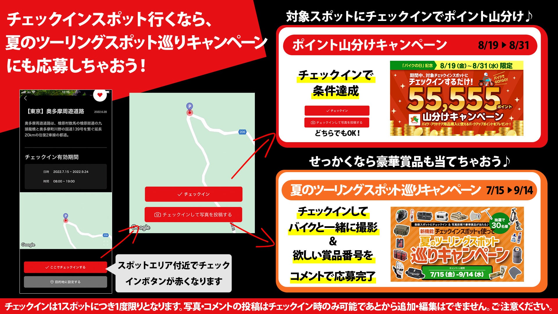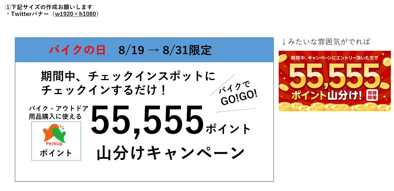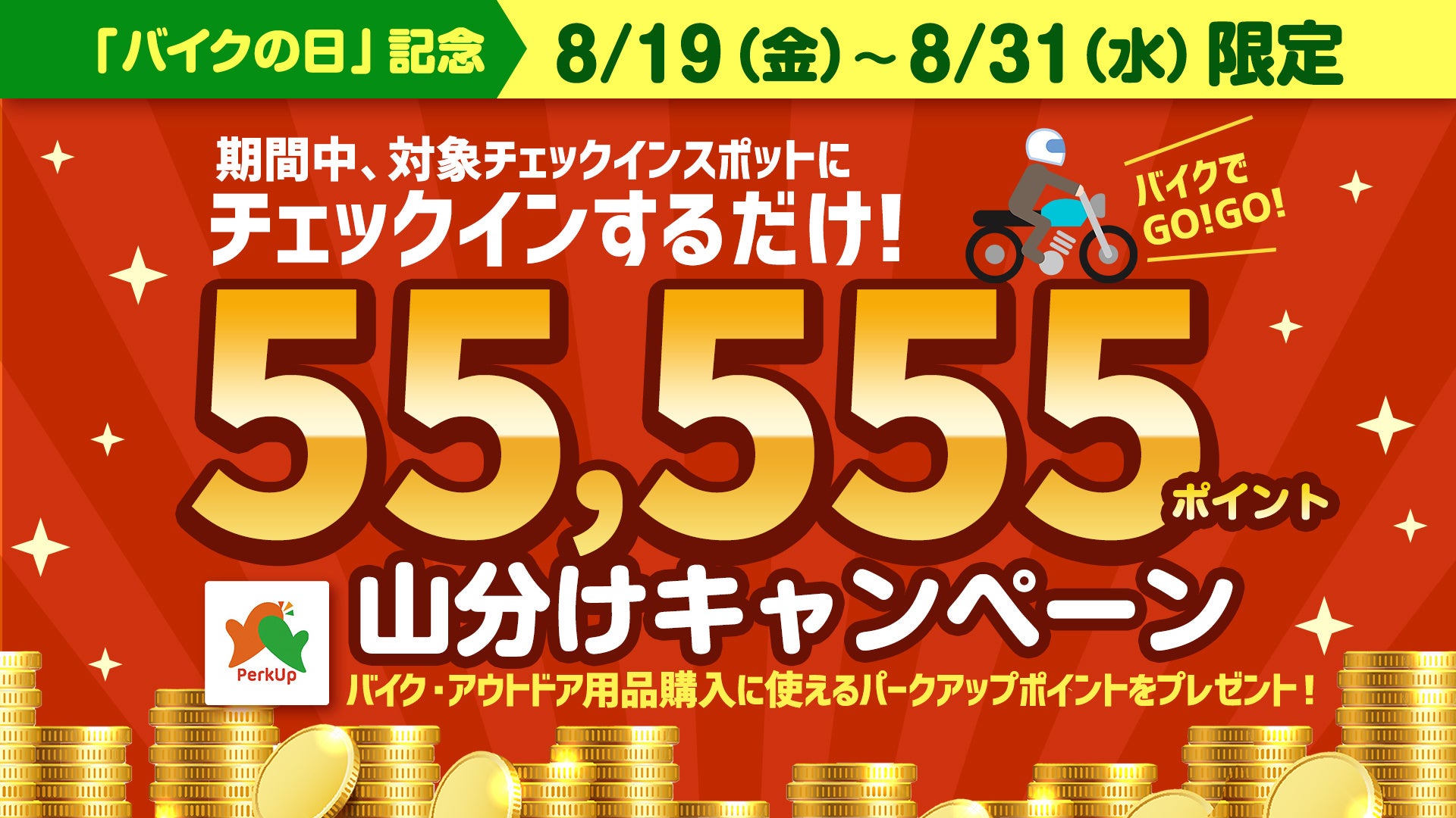 ツーリングログアプリRiders Squareでは8月19日の「バイクの日」を記念して、8/19(金)~8/31(水)の期間中、新機能「チェックインスポット」に掲載中の対象チェックインスポットにチェックインしたユーザーを対象に、バイクパーツやアウトドア用品に使えるパークアップポイントが当たる「55,555ポイント山分けキャンペーン」を開催いたします。