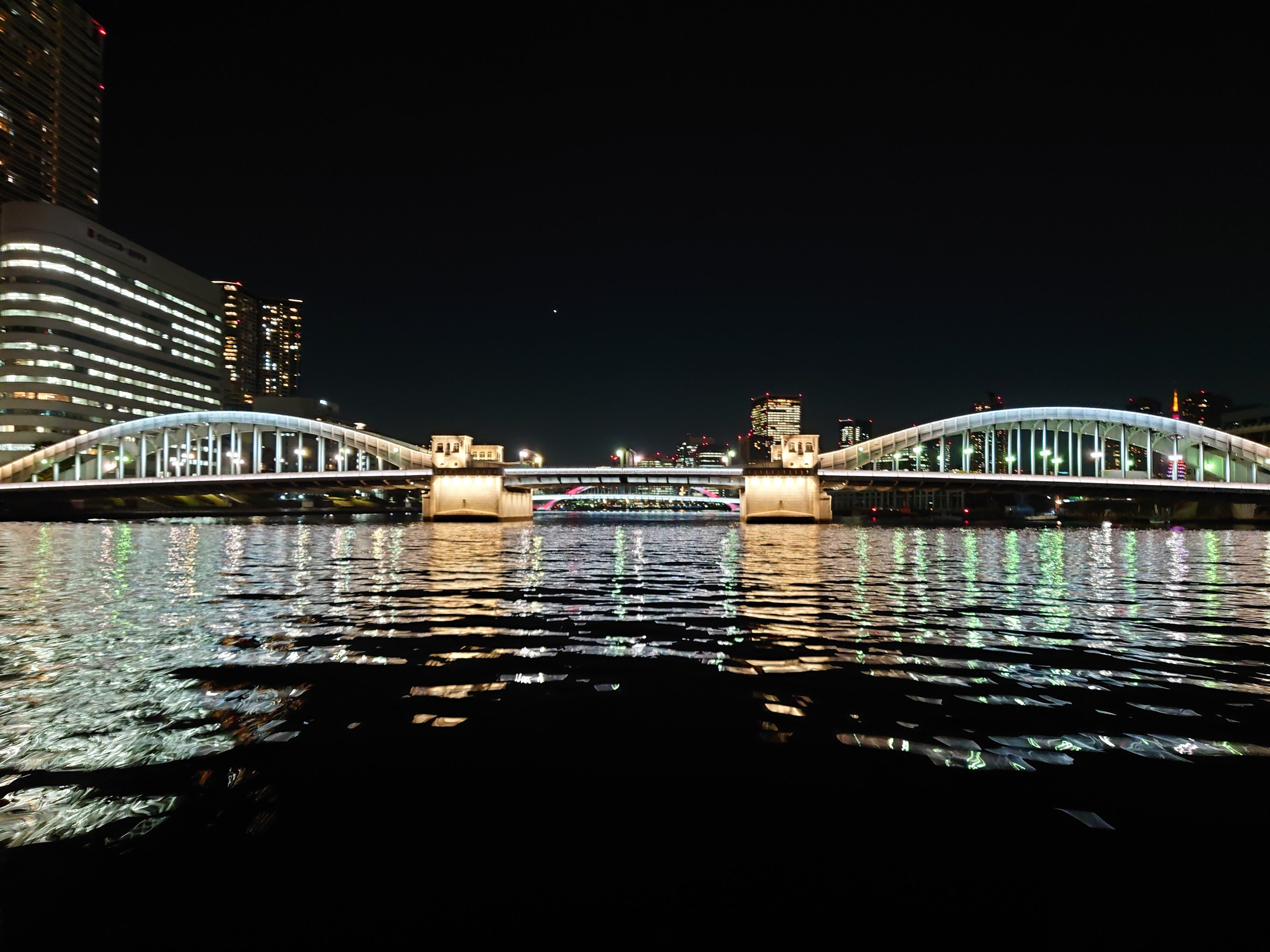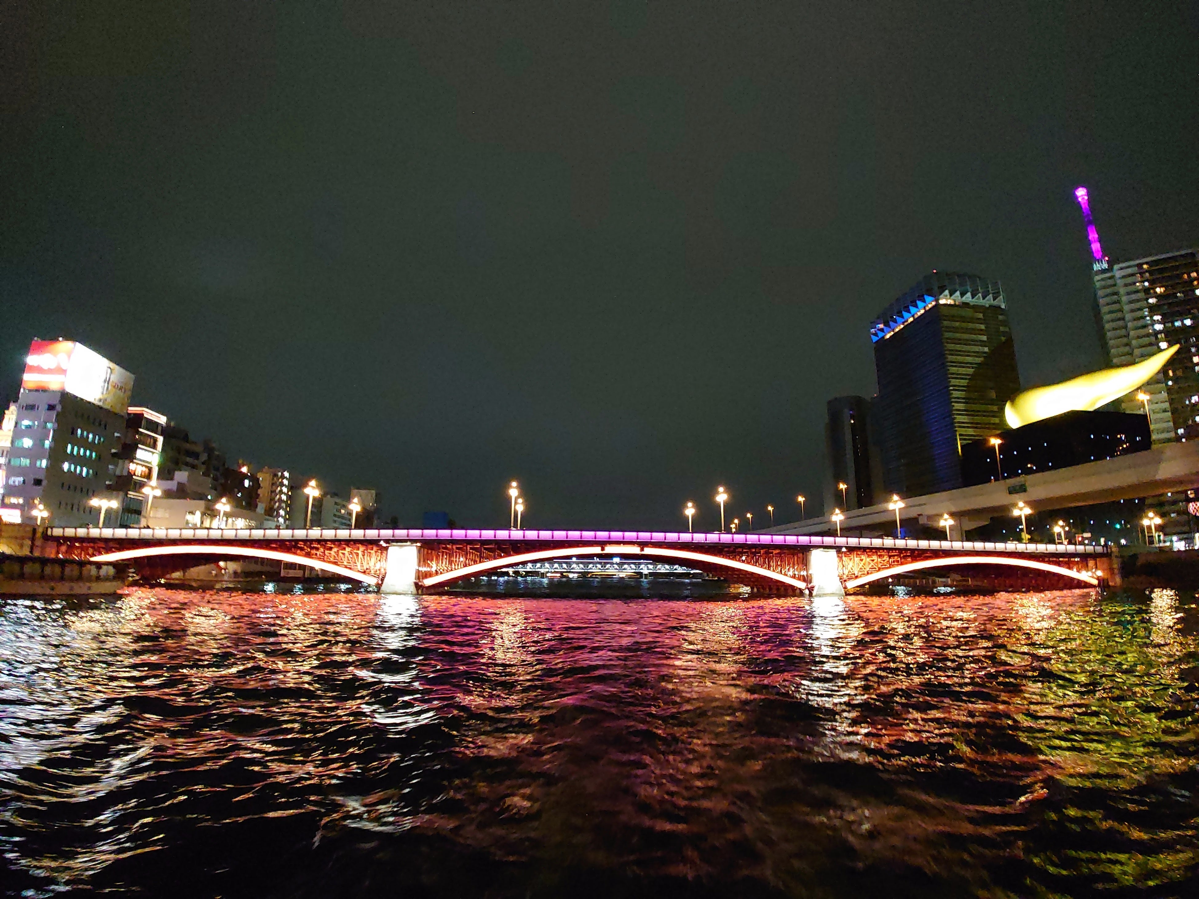 隅田川に架かる橋は全て異なるデザイン。夜になると、全ての橋が一斉にライトアップされます。