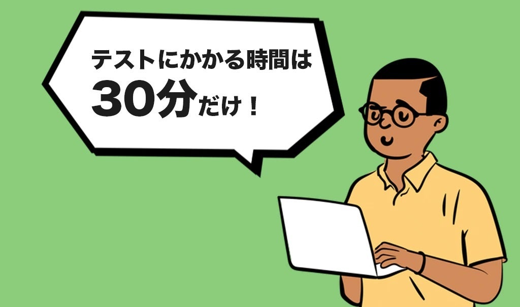 テストはオンラインで完結し、テスト時間は問題数により、20分から40分程度、平均すると30分程度です。