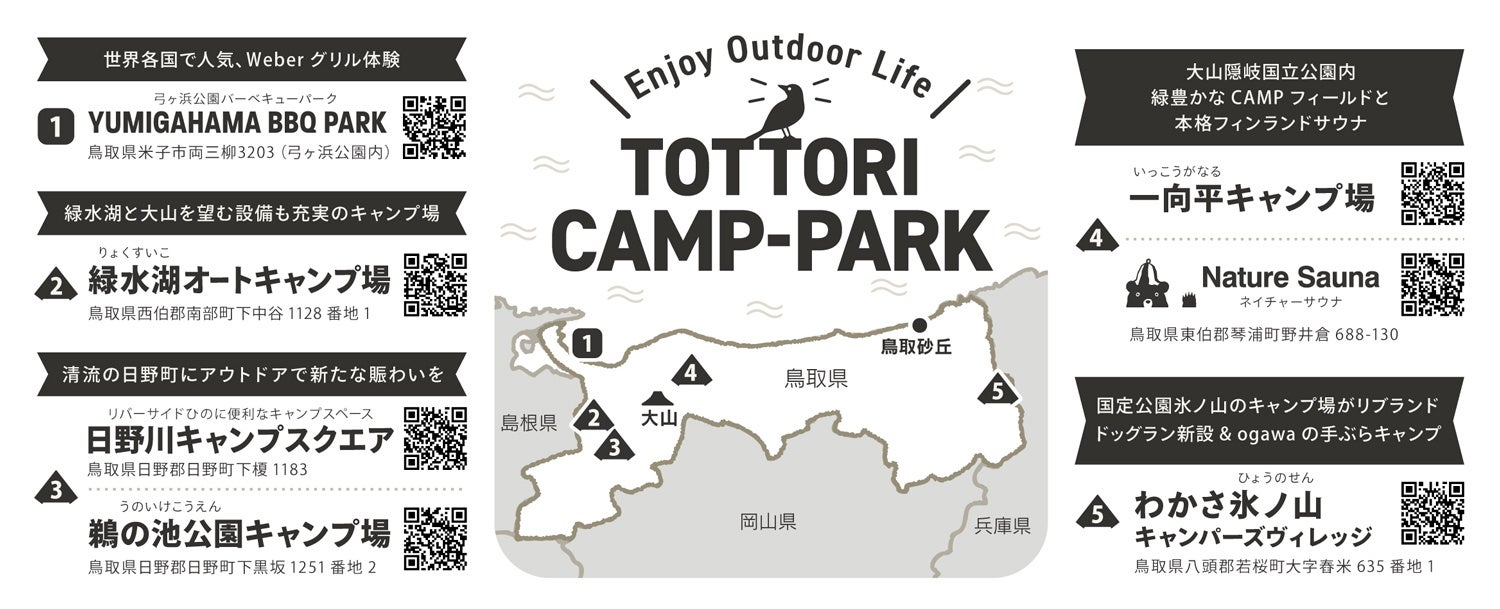 鳥取県の豊かな大自然を、アウトドアでもっと楽しみたい。そんな想いから始まった事業は6年めを迎え、運営に関わるグループキャンプ場は現在5カ所。いずれもキャンピングカー乗り入れが可能で、多彩な自然を楽しめる鳥取県の東西横断ドライブ旅行におすすめです。TOTTORI-CAMPPARKのキャンプ場は、広域集客を意識した発信活動により利用者の6割以上が鳥取県外からという特長があり(2023年度利用者合計数)、鳥取県内各地で「アウトドアを通じた地方創生」を実践しています。