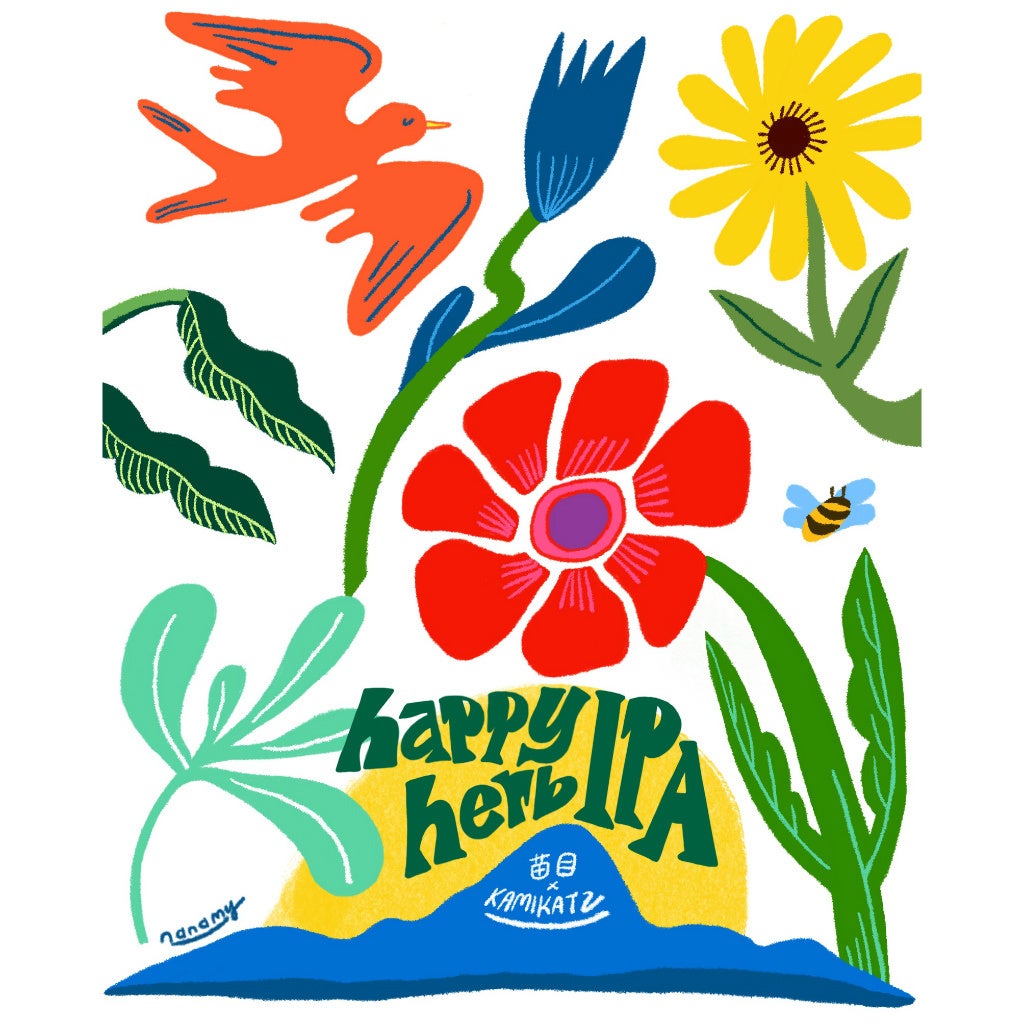 千葉県鴨川市で環境再生に取り組むコミュニティファーム「naeme」とのコラボレーション。「naeme」で採れたセントジョンズワート(別名ハッピーハーブ)をはじめ、 イエルバブエナ、コモンワームウッド、レモンバーベナ、レモンタイム、イブキジャコウソウなど気分を晴れやかに、ハッピーな気分にしてくれると言われる6品種のハーブを 「mitosaya」薬草園蒸留所の協力でハーブ蒸留水にし、しっかりとした味わいのIPAと合わせ爽快に仕上げました。