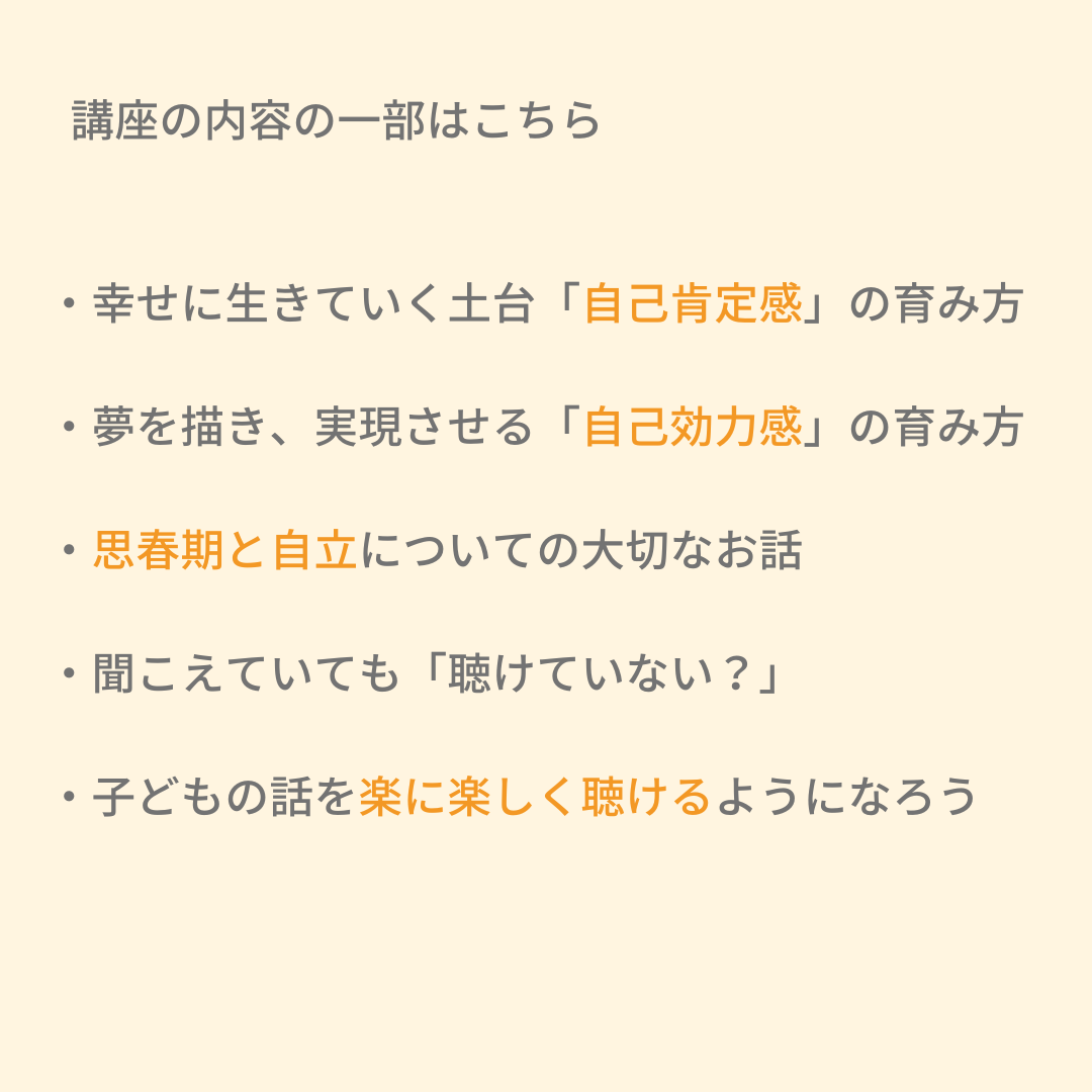 *聴くことにもコツや技術があり、そのちょっとした心掛けで今後の子供との関係が変わったり、子供の生きていく力を育むことができるなど、物凄い沢山のことを得られるのだと学びました。 講座の雰囲気は優しく安心な空気で、とても素敵な講座でした。