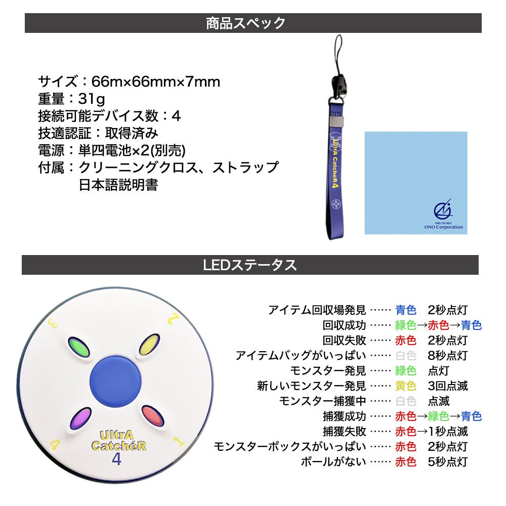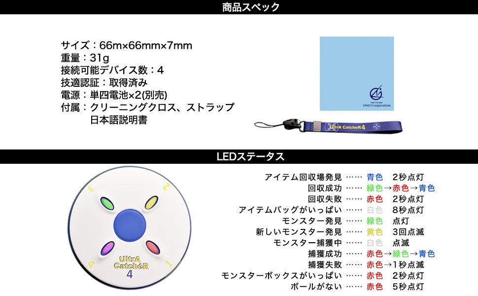 機能は11パターンのLEDの色や挙動によって、「アイテム回収」や「ポケモン発見」などのステイタスをお知らせ!「ポケット オートキャッチャー UltraCatcher4(ウルトラキャッチャー4)」で、より快適な「ポケ活」ライフをGETしませんか?