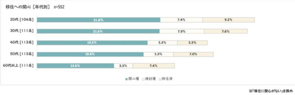 また、若くなればなるほど地方移住に関心が強まる傾向にあり、20代の方が地方移住への関心が最も強い傾向にあります。