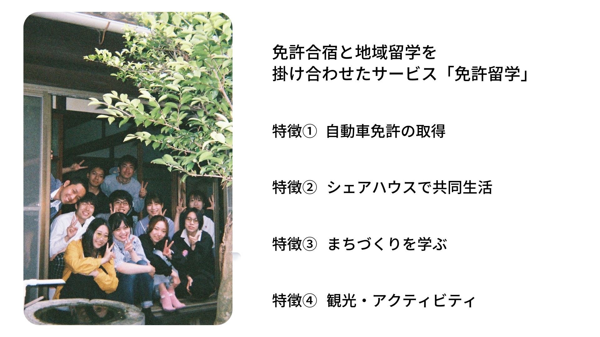 地域に関心のある人たちが地元密着のシェアハウスに滞在し、地域の魅力を堪能しながらまちづくりについて学び、自動車免許も取得できるプログラムを提供しています。