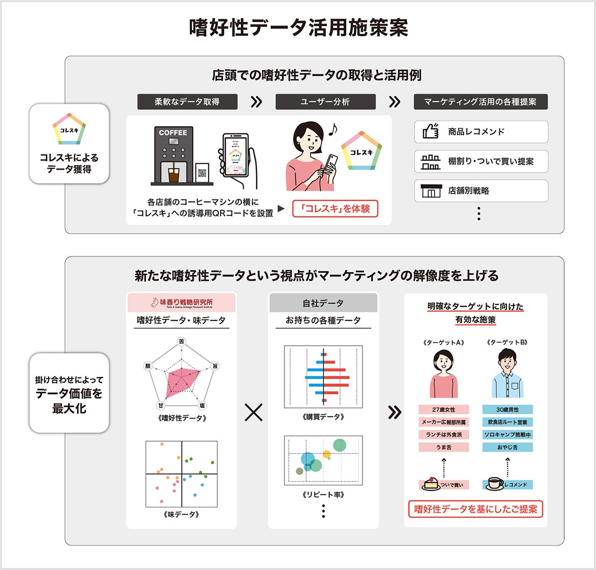 嗜好性データは、従来のマーケティングに利用されてきたデモグラフィックデータや購買データと同様に扱うことができ、新たな視点から消費者理解を深め、企業がターゲットとする対象の解像度を上げることが可能です。さらに、嗜好性データ・味データといった味香り戦略研究所独自データと、企業が持つ各種データを掛け合わせることで、そのデータ価値を最大化し、データに基づいたマーケティング戦略をご提案します。