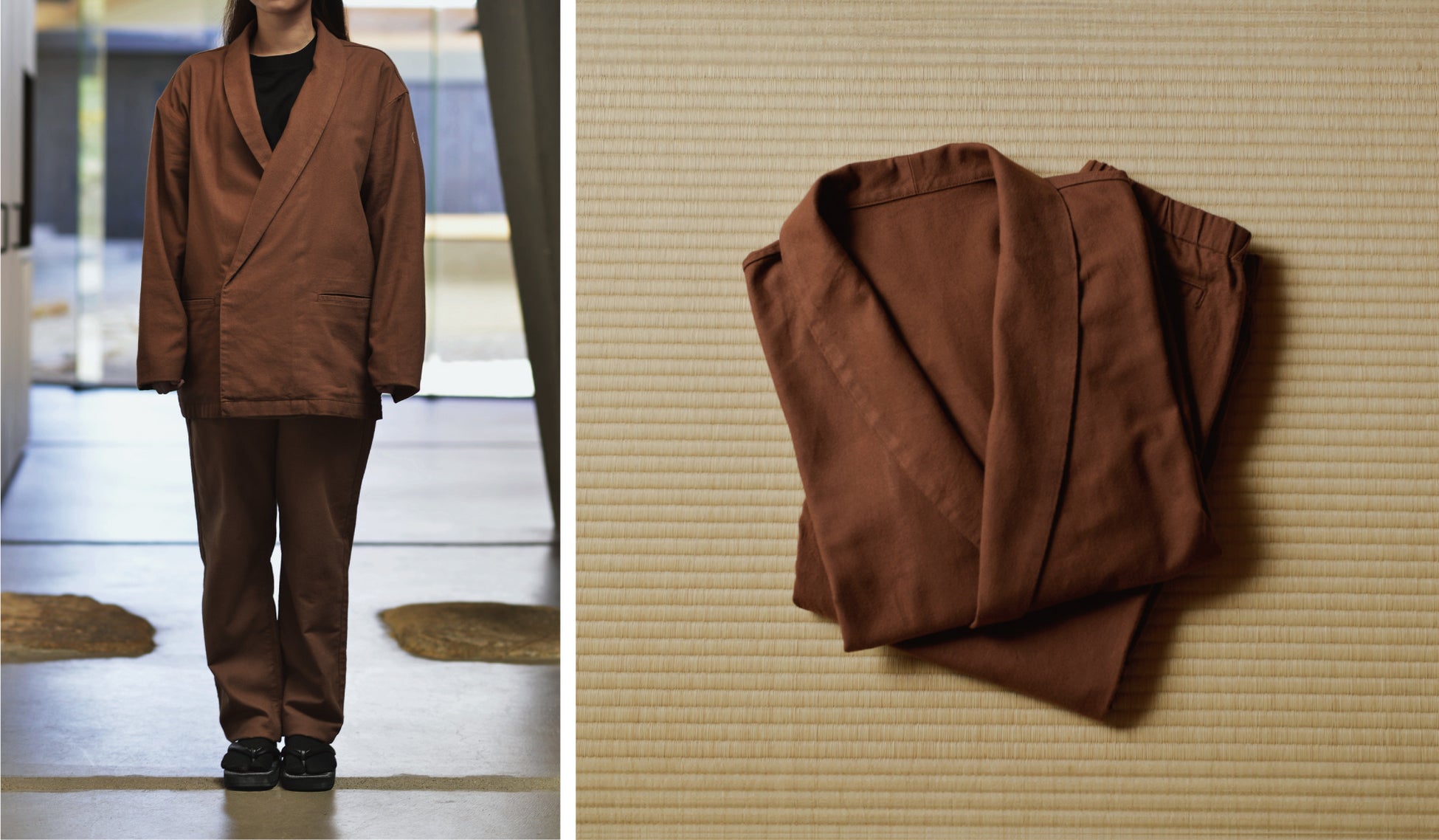 このリメイクプロジェクトにおいては、地元・岡山県のアパレルブランド「iori products」とデザインファーム「nottuo」が共同でデザインを手掛け、倉敷市児島の工場で製造するというローカルなプロセスを大切にしています。当館のオリジナル館内着は、オーガニックコットン100%の生地を用い、着心地の良さはもちろん、健康や環境負荷への配慮が共存した一着として、お客様に高評価をいただいておりました。
