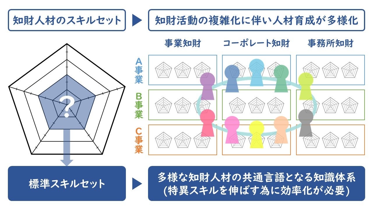 各人材の特異スキルを伸ばすことに育成リソースを確保して頂くためにも、知財人材の標準スキルの習得については私共にご支援させて下さい。