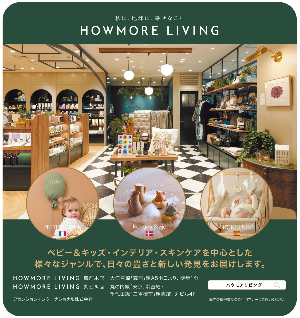 HOWMORE LIVINGとマタニティマークのタイアップ広告が、1年間都営地下鉄大江戸線優先席エリアに掲載されます。