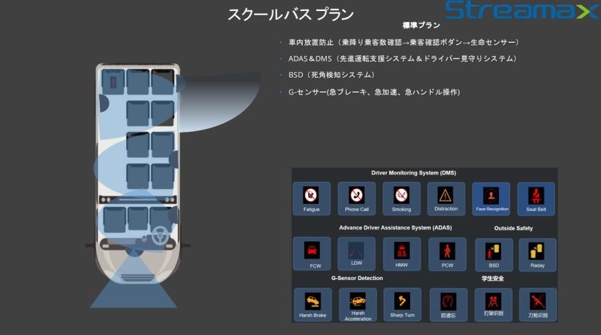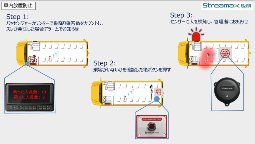 それぞれで管理されているスクールバス(送迎用バン含む)に弊社の「スクールバスAI見守りソリューション」を搭載することにより、車内への置き去りによる事故を、3ステップで防止いたします。園児や児童のご乗車履歴と下車される状況をリアルタイムで把握することが可能となり、管理者(園)、運転手、保護者の方々がご安心頂けます。また、運転手さんの安全運転を支援をする、車両安全運転支援カメラ(ADAS)、運転手見守りカメラ(DMS)、車両死角検知カメラ(BSD)などを搭載すれば、運行中の交通事故、駐車場内での巻き込み事故なども防げます。実績としましては、米国やUAEをはじめ海外でのスクールバスへ導入済みで、昨年日本でも導入実績がございます。なお、日本においては、国内の基準(道路交通法、自動車関連機器の認定等)に準拠させるため、導入予定となる車両の確認(車内外の状況、設置、配線、運転席、乗車席等)を確認させていただく必要がございます。