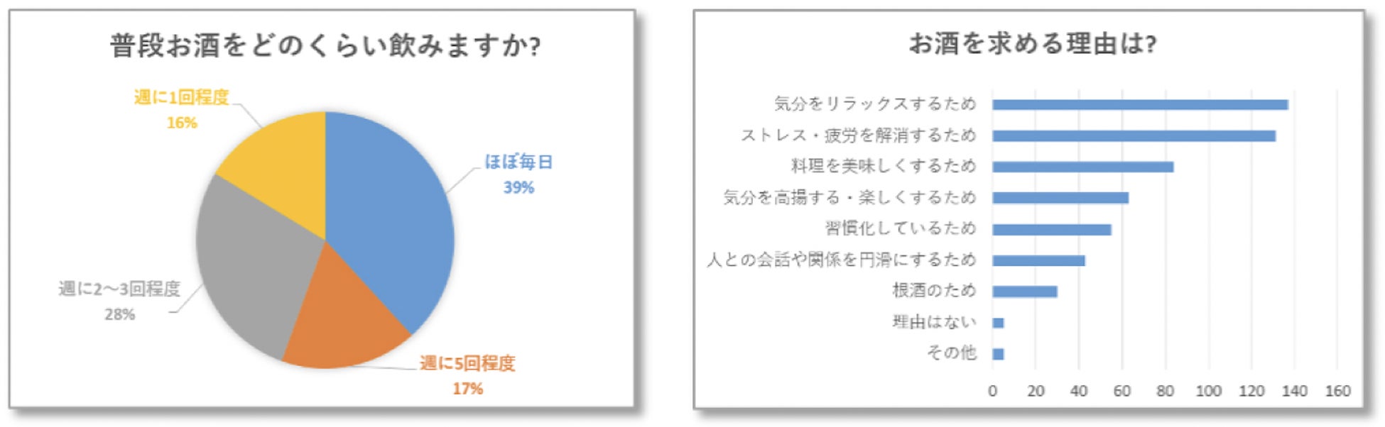 「普段お酒をどのくらい飲みますか」の回答に「ほぼ毎日」「週5日程度」で50%を越える結果となりました。