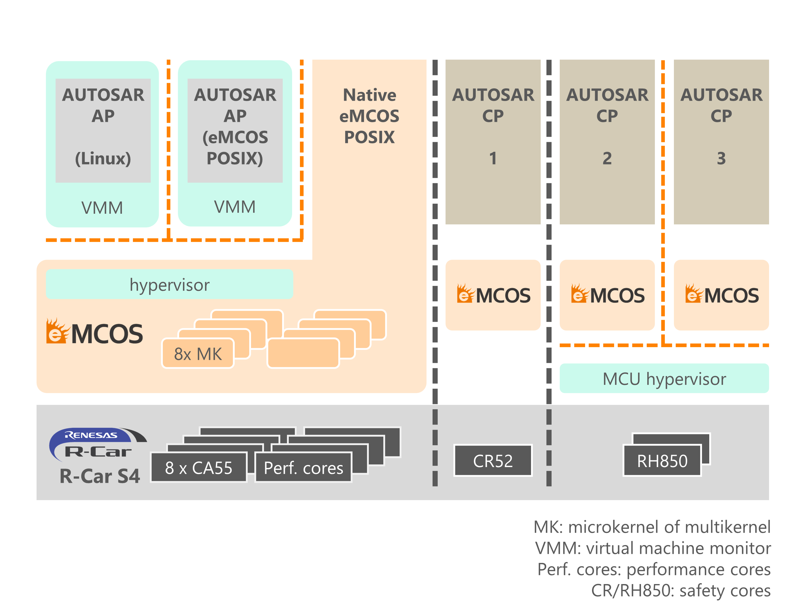 PoCでは、さまざまなeMCOSプロファイルが使用されています。eMCOS Hypervisor®は高性能8x Arm® Cortex®-A55コアで使用されており、eMCOS AUTOSARプロファイルはAUTOSAR Classic PlatformのベースとしてCortex-R52コアで起動されています。さらに2つのRH850 G4MHコア上には、AUTOSAR Classic Platformが搭載されています。高性能8x Cortex-A55コアは、eMCOS Hypervisorによって安全かつ確実にリアルタイムで仮想化され、LinuxまたはeMCOS POSIX上でAUTOSAR APゲストをホストします。さらに、このタイプ1.5ハイパーバイザーを使用することで、ネイティブPOSIXプロセスを並行してホストすることも可能になっています。これは、従来のタイプ1ハイパーバイザーにはない利点です。